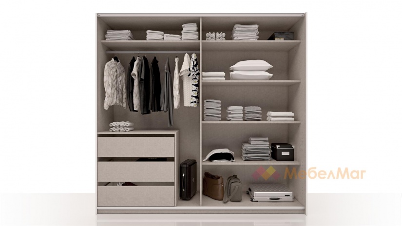 Той е двукрилен гардероб, който се отваря чрез плъзгащи врати. Модерният плъзгащ механизъм прави отварянето на вратите лесно, без да се тревожиш, че трябва да осигуряваш допълнително пространство пред самия гардероб. Щом ги отвориш, вътре ще откриеш два големи рафта с оптимална височина, два лоста за закачалки и скрин с три чекмеджета.