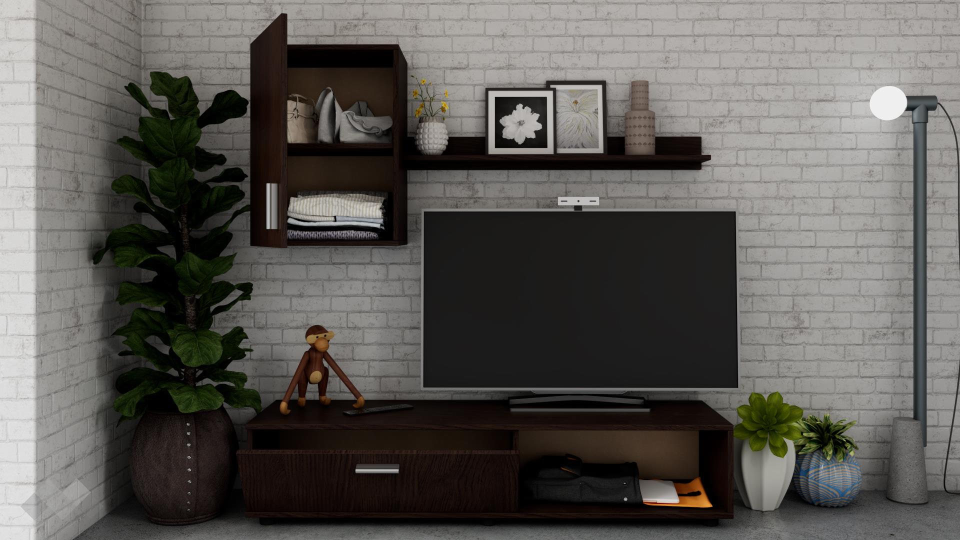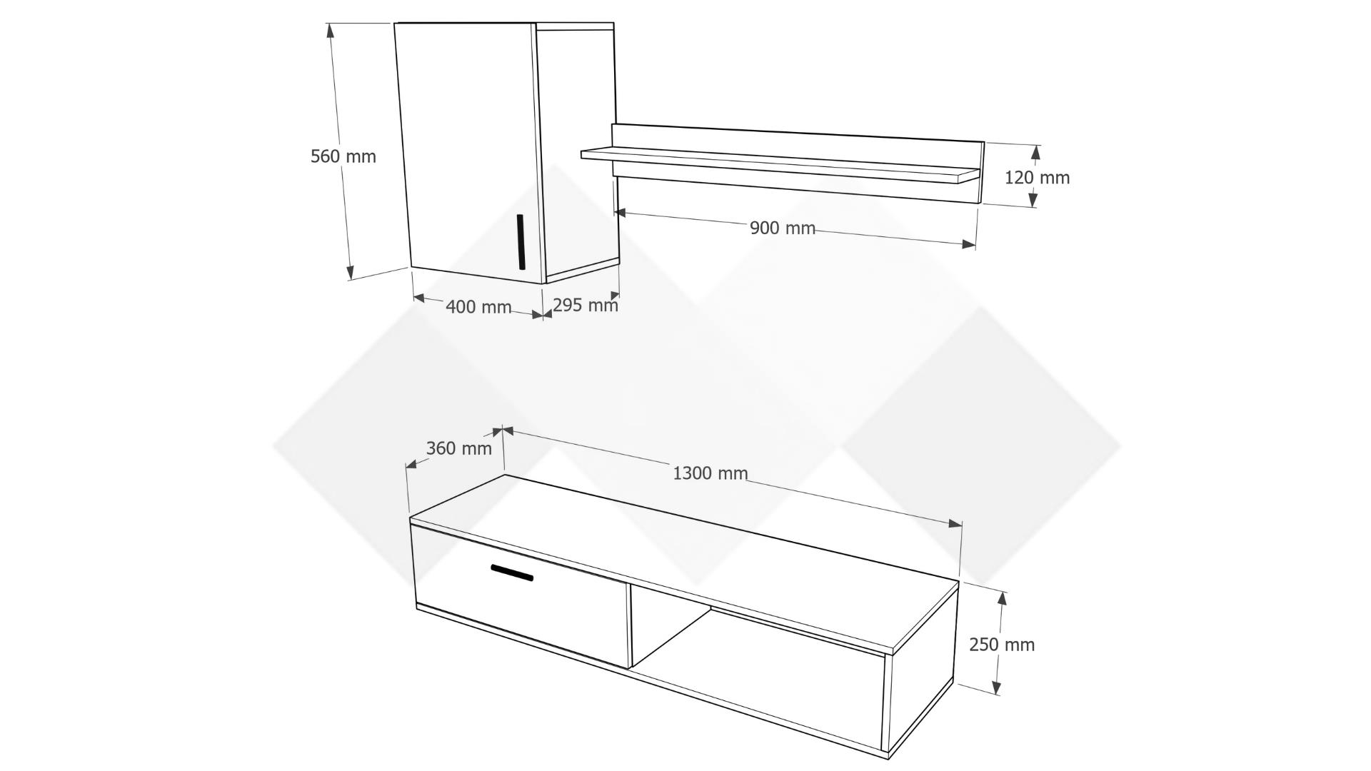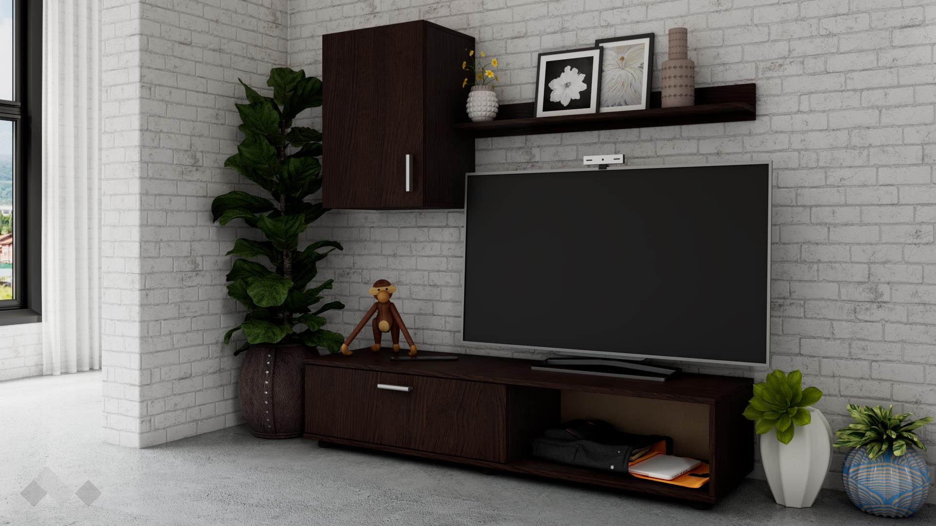 ТВ шкафът се състои от шкаф с падаща врата и отворена ниша, където да поставиш цялата си съпътстваща техника като ТВ приемници, DVD плейъри и други. Окаченият шкаф ще ти предостави достатъчно място за всички неща, които предпочиташ да останат скрити от погледите, но в същото време искаш да ти бъдат винаги под ръка. Етажерката е идеална за подреждане на любимите ти книги, сувенири, фотографии или стилни декорации.