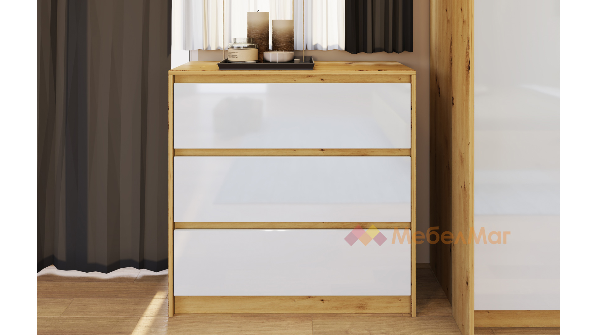 Спален комплект Хало включва и елегантен скрин с три големи чекмеджета, който ти предоставя още място за съхранение на лични вещи. Той е изчистен, семпъл и перфектно допълва останалите мебели в комплекта. Чекмеджетата на скрина също са с телескопични водачи.