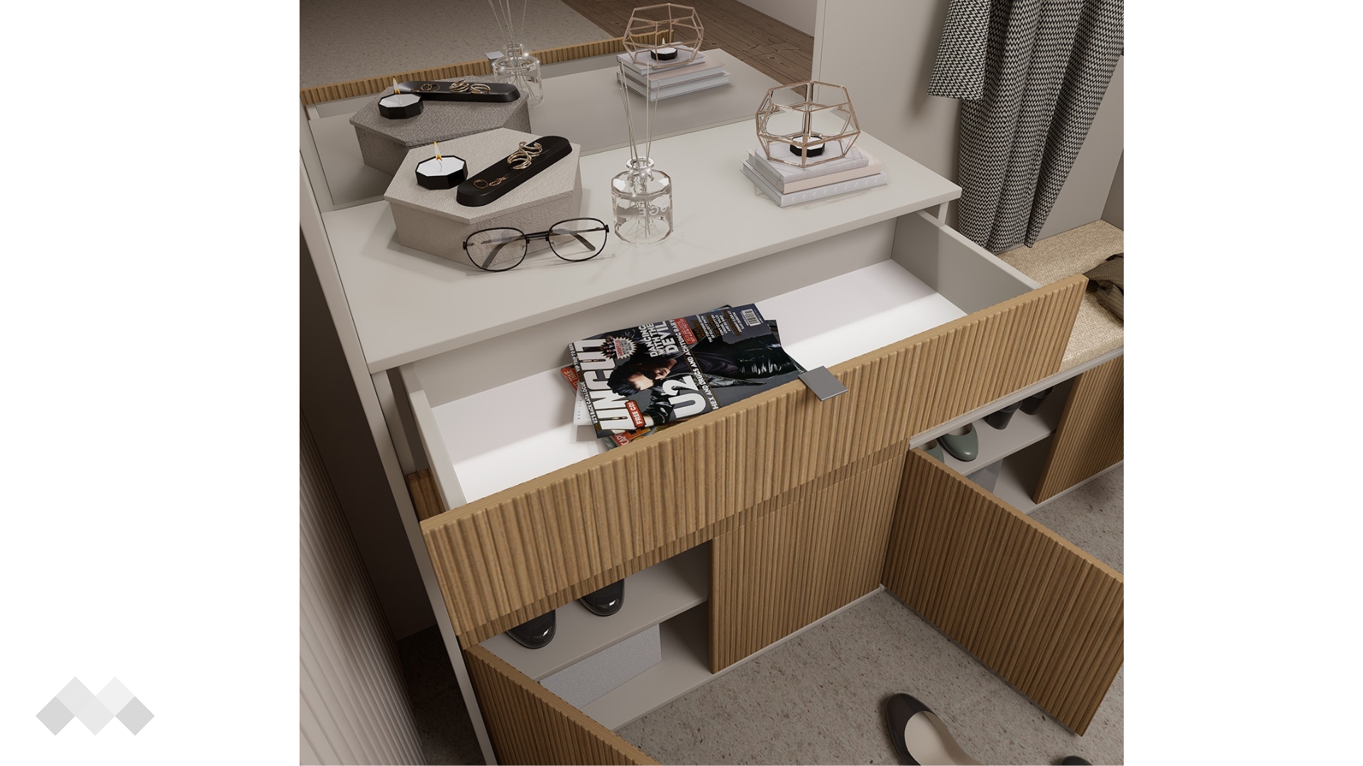 Благодарение на четирите затворени шкафа и трите чекмеджета, разполагаш с достатъчно пространство, за да организираш всички вещи, които използваш ежедневно. Двата долни шкафа са оборудвани с по един вътрешен рафт, който улеснява подредбата на обувки, чанти или други вещи. Трите чекмеджета осигуряват допълнително място за съхранение на по-дребни принадлежности като ключове, шалове, ръкавици или документи, които искаш да са винаги под ръка.