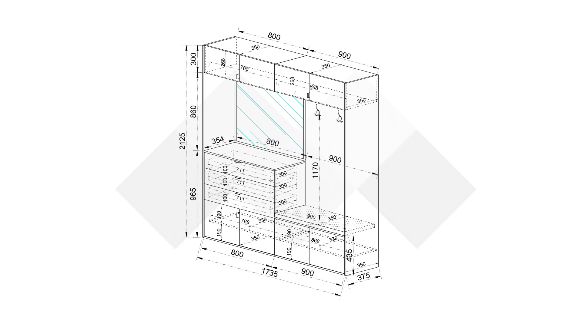 Портмантото предлага възможност за монтаж в два варианта - частта със закачалките и частта с огледалото и чекмеджетата могат да се монтират по твое желание отляво или отдясно.