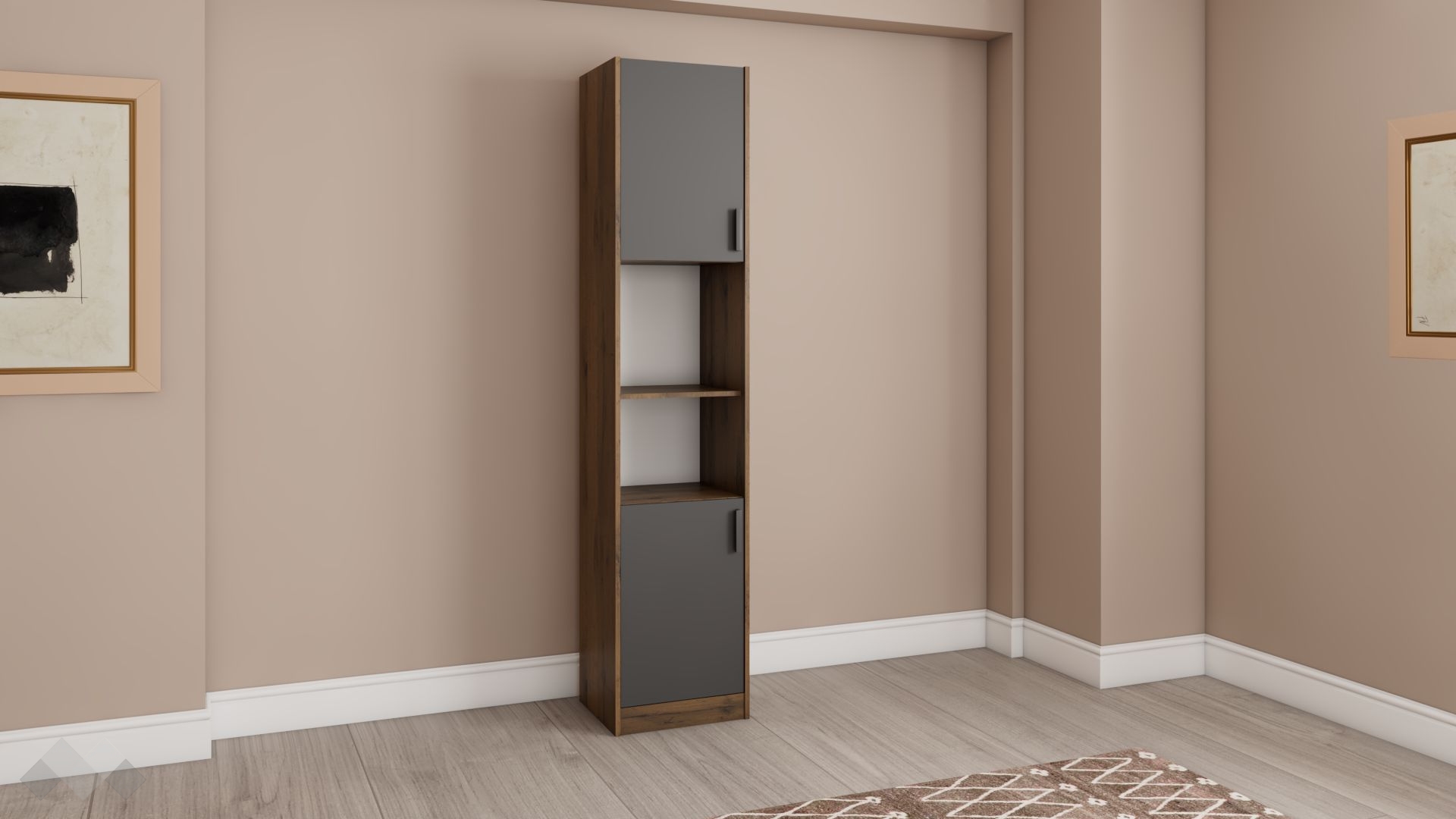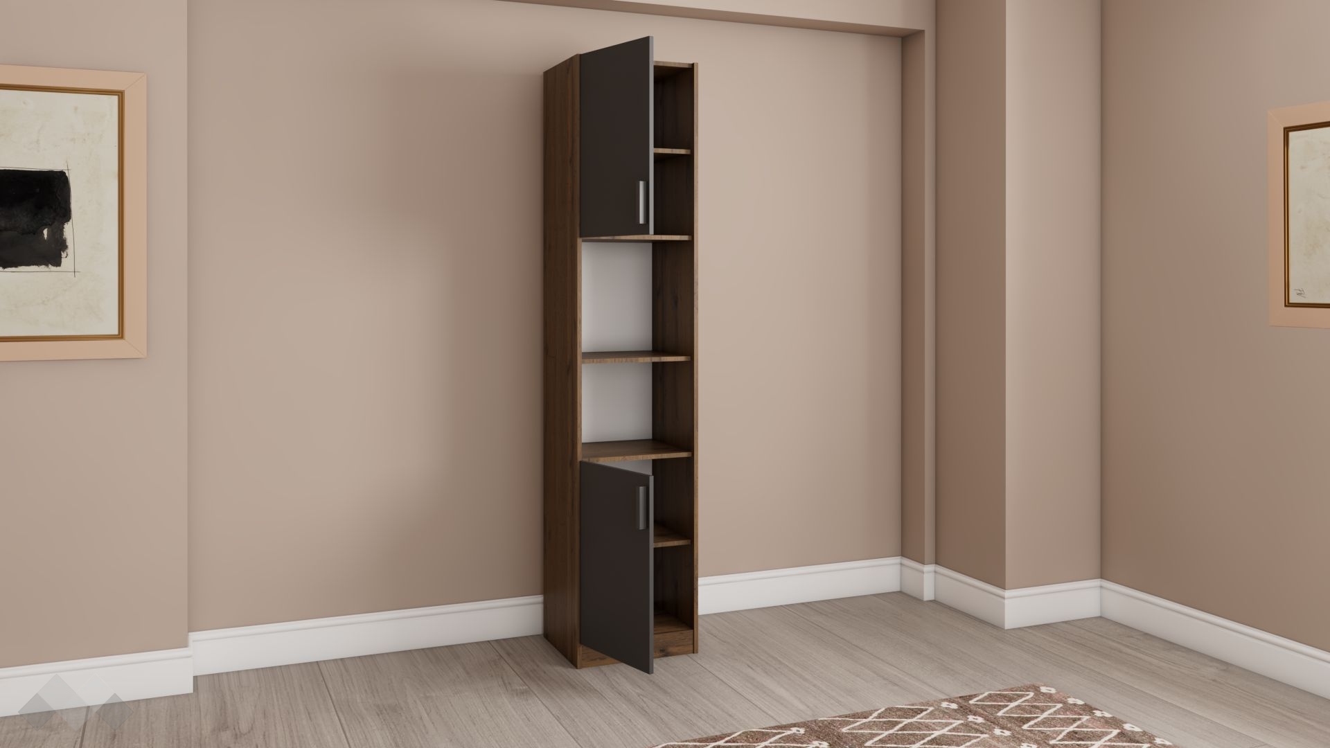 Благодарение на семплия си, изчистен дизайн, висок шкаф с две врати Хироу, се вписва във всеки интериор. Това ти позволява да създадеш и свой собствен стил, когато подреждаш вещи и украси върху него. Той е с 2 открити рафта и 2 вратички.