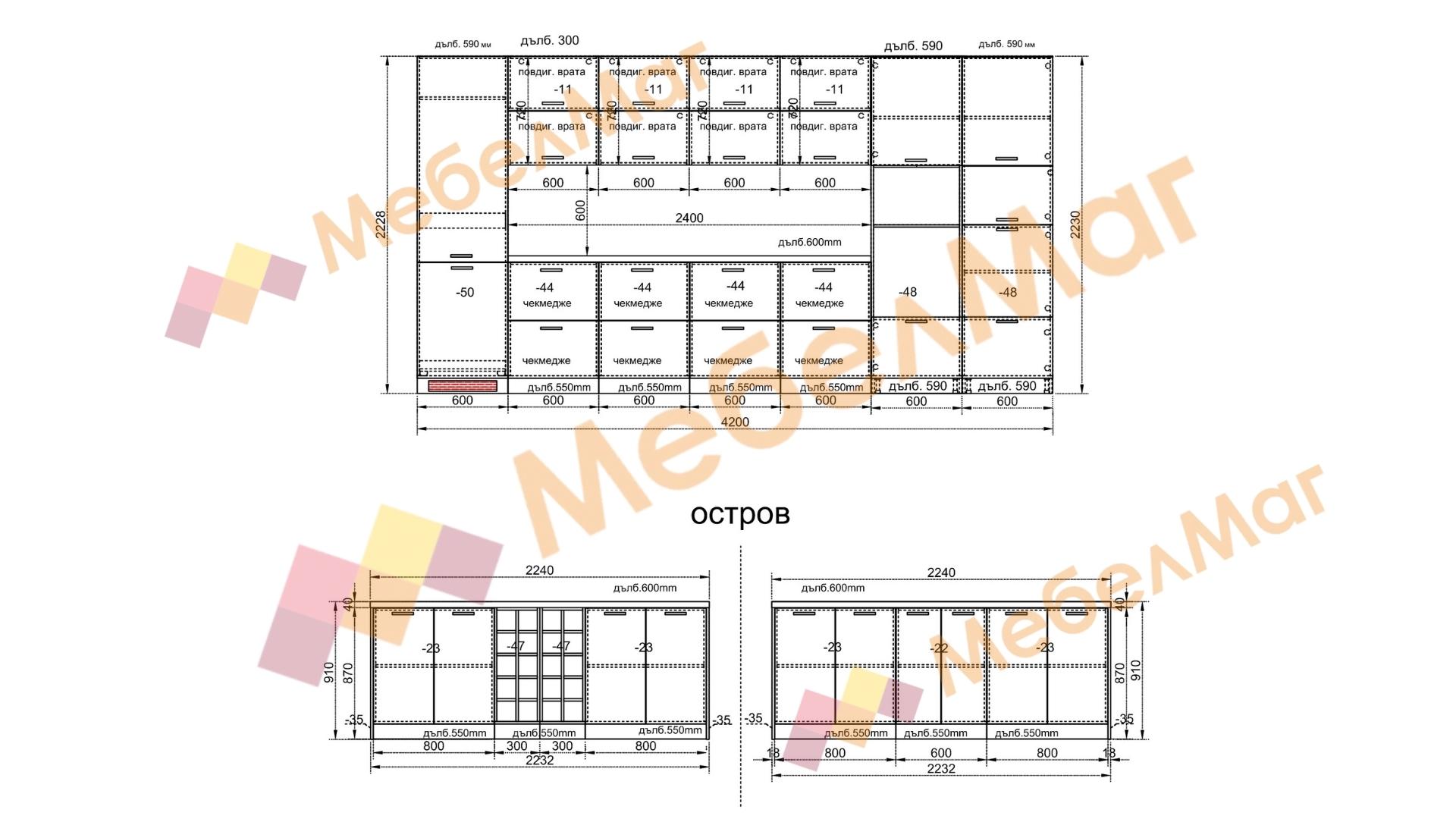 Долен ред: Д: 420 см. Ш: 60 см. В: 223 см.