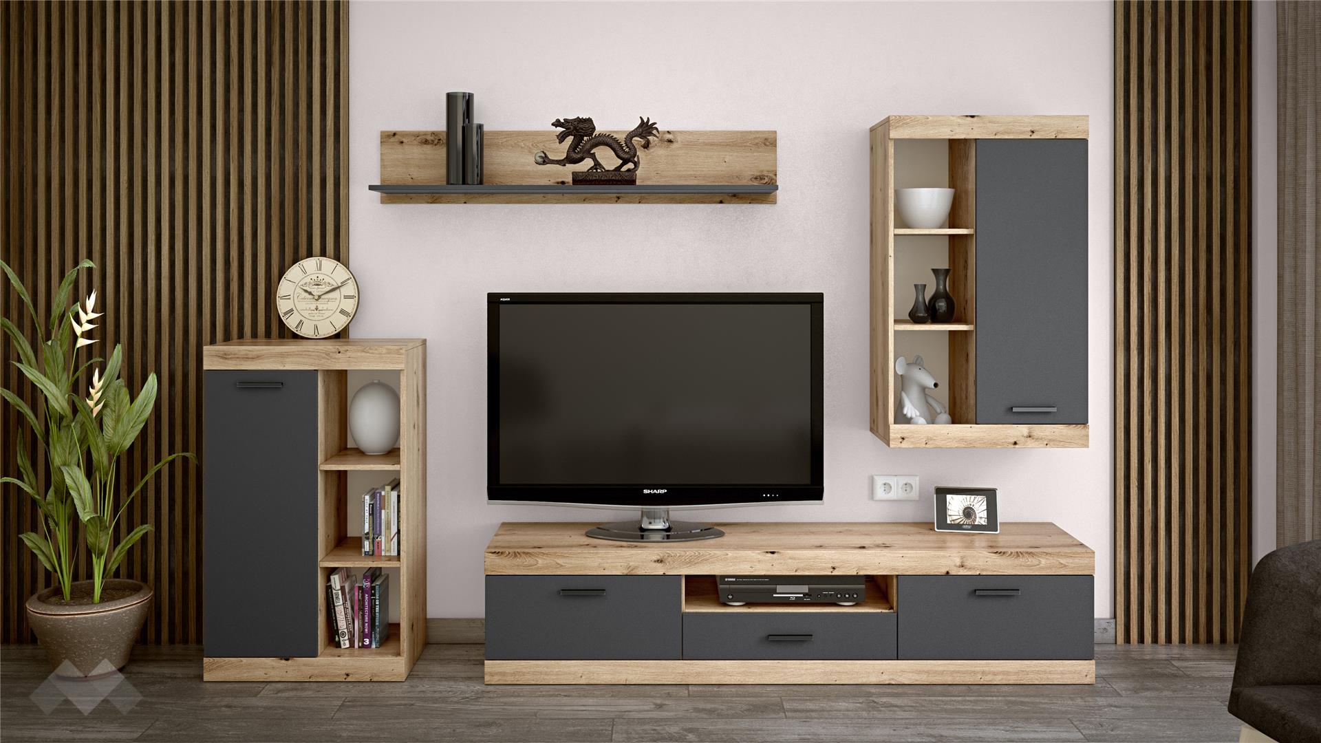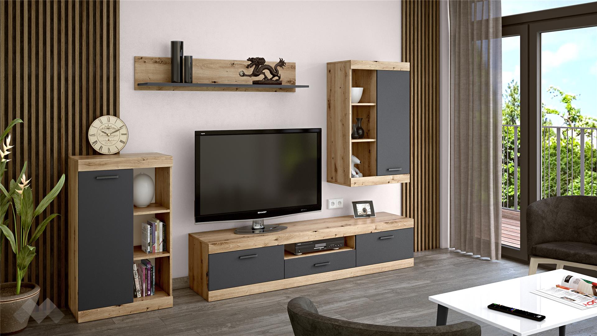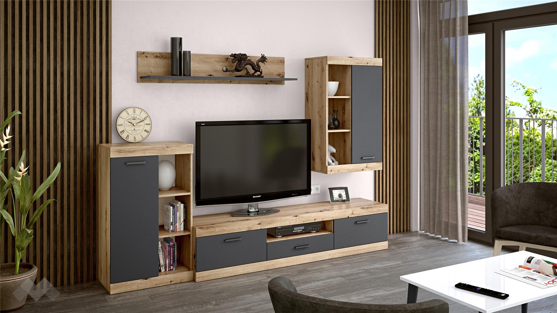 ⭐ Предимства: ✓ ТВ шкаф ✓ висок шкаф с открити рафтове ✓ етажерка ✓ модерен винтидж декор ✓ етажерка ✓ модерен декор ✓ качествена изработка ✓ 16 мм ПДЧ
