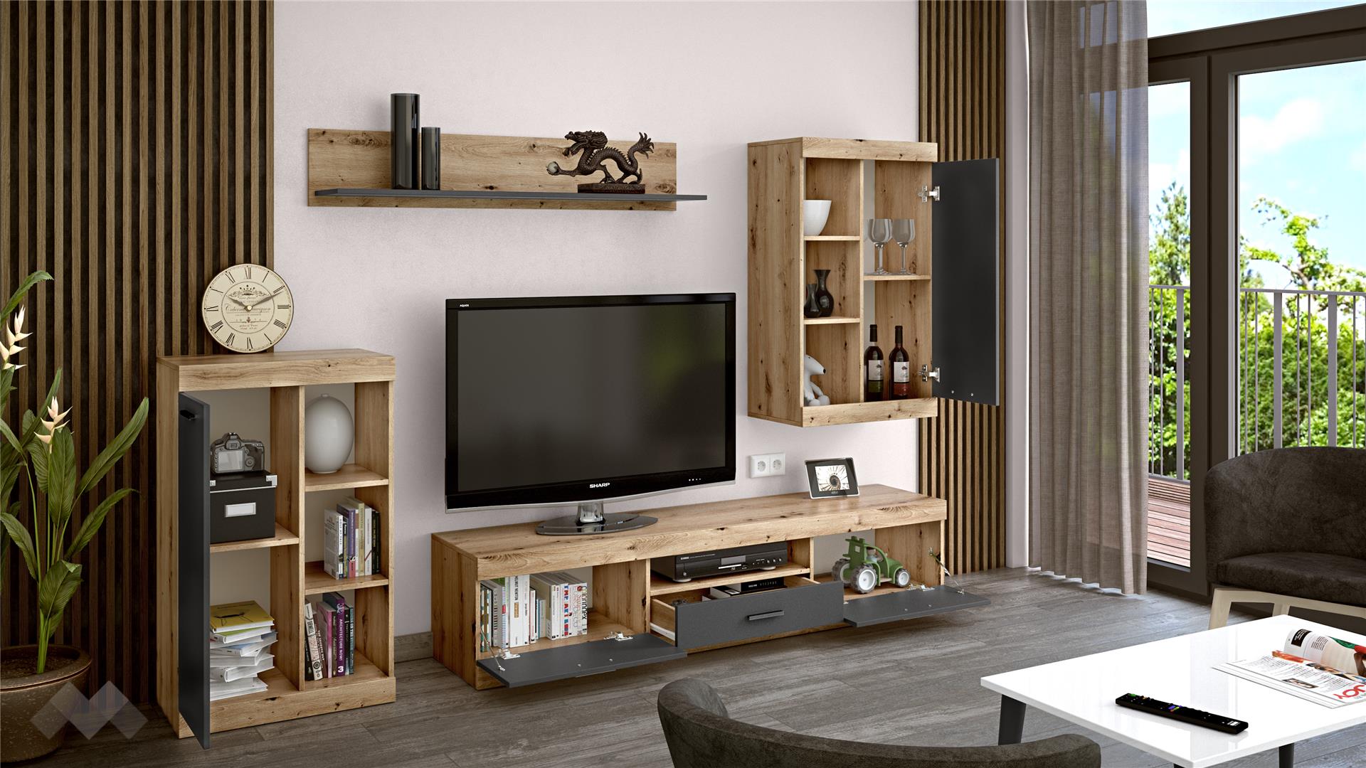 ✓ ТВ шкаф ✓ висок шкаф с открити рафтове ✓ етажерка ✓ модерен винтидж декор ✓ механизъм за плавно затваряне на вратите ✓ етажерка ✓ модерен декор ✓ качествена изработка ✓ 16 мм ПДЧ