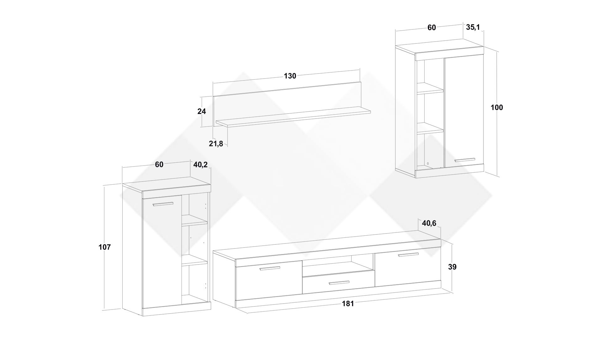 Д: 181 см Ш: 40.6 см В: 39 см Висок шкаф: Д: 60 см Ш: 40.2 см В: 107 см