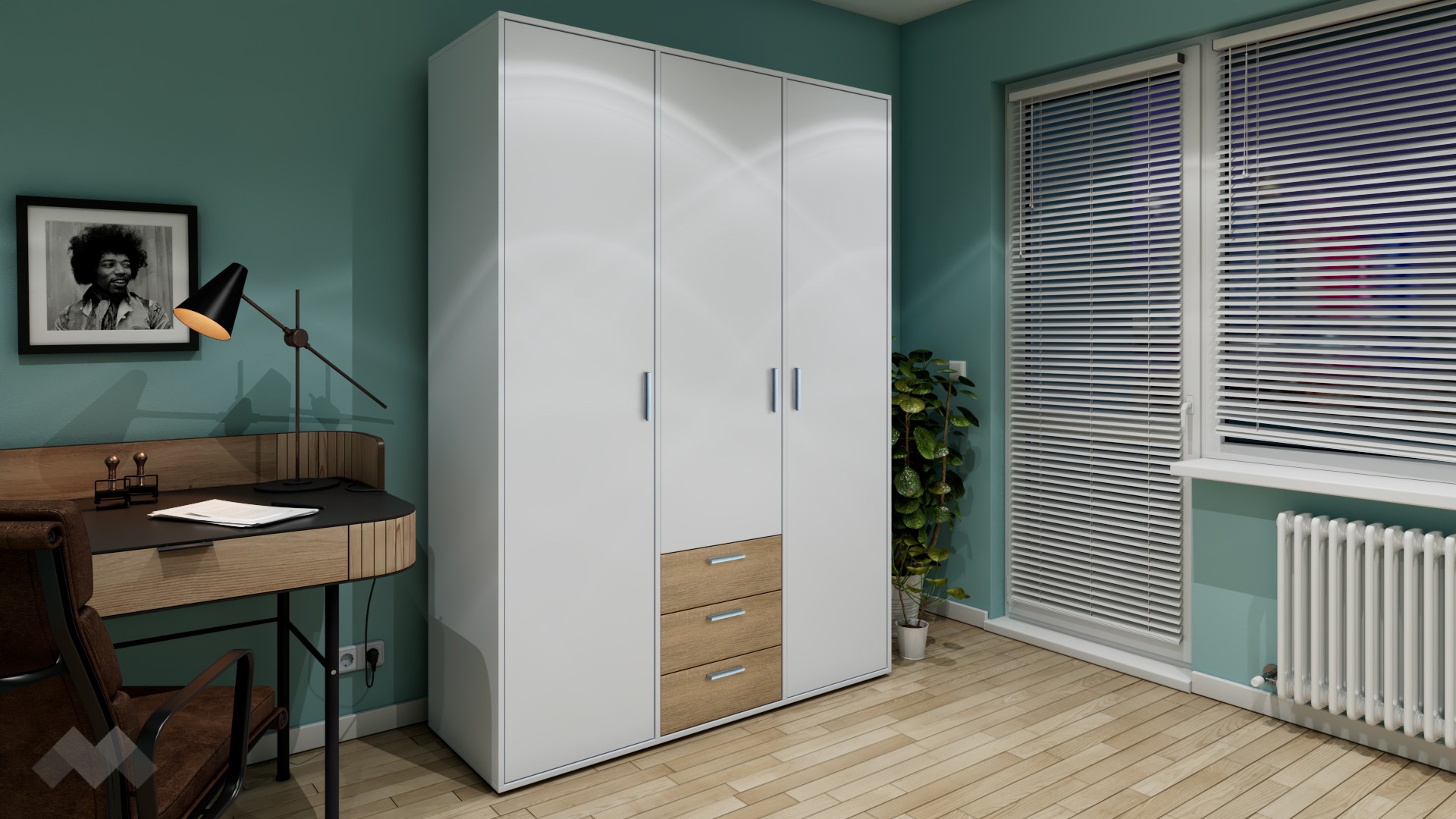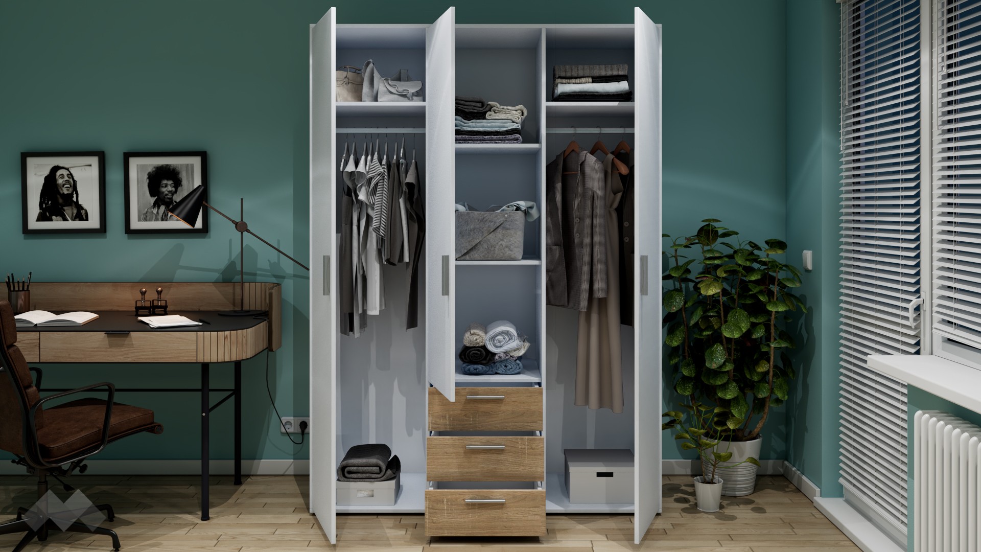Този гардероб радва със своята практичност. На твое разположение са два лоста за закачалки в крайните крила, четири рафта за съхранение на дрехи или вещи и три чекмеджета в средното крило на гардероба. Така всичко ще бъде перфектно организирано.