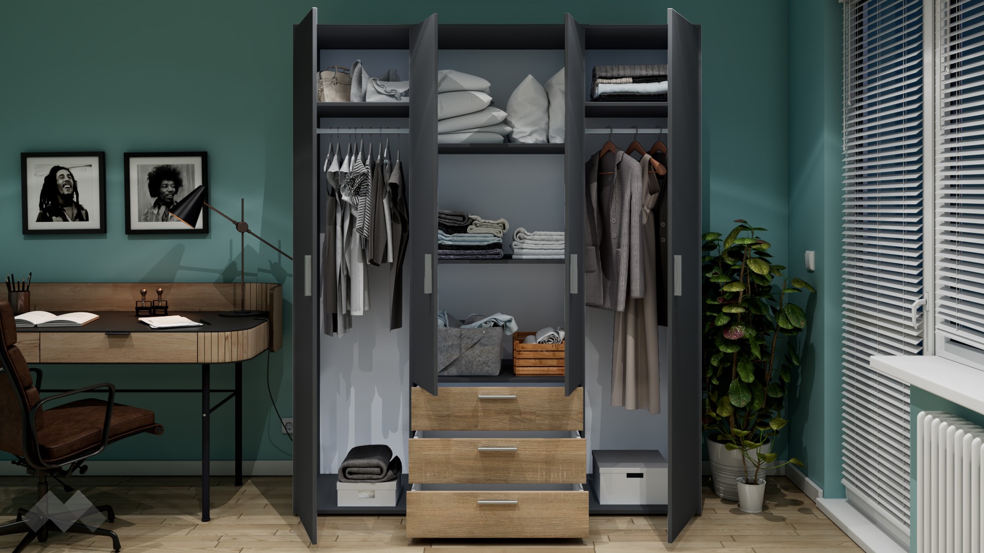 ⭐ Предимства: ✓ четирикрилен ✓ 3 чекмеджета ✓ 4 рафта ✓ 2 лоста за закачалки ✓ модерен декор ✓ практично разпределение ✓ качествена изработка ✓ 16 мм ПДЧ