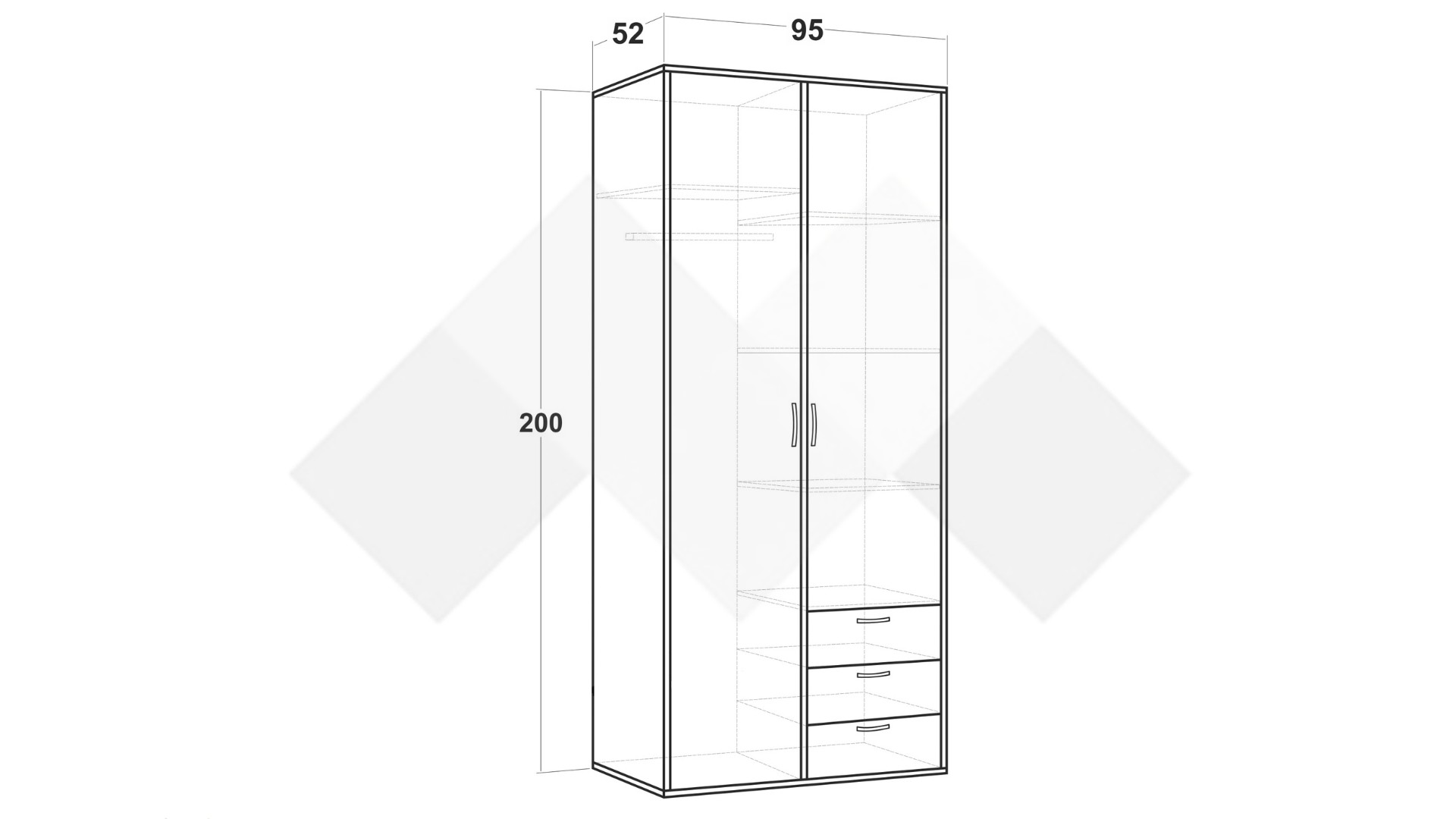 ⭐ Предимства: ✓ двукрилен ✓ 3 чекмеджета ✓ 4 рафта ✓ лост за закачалки ✓ модерен декор ✓ практично разпределение ✓ качествена изработка ✓ 16 мм ПДЧ