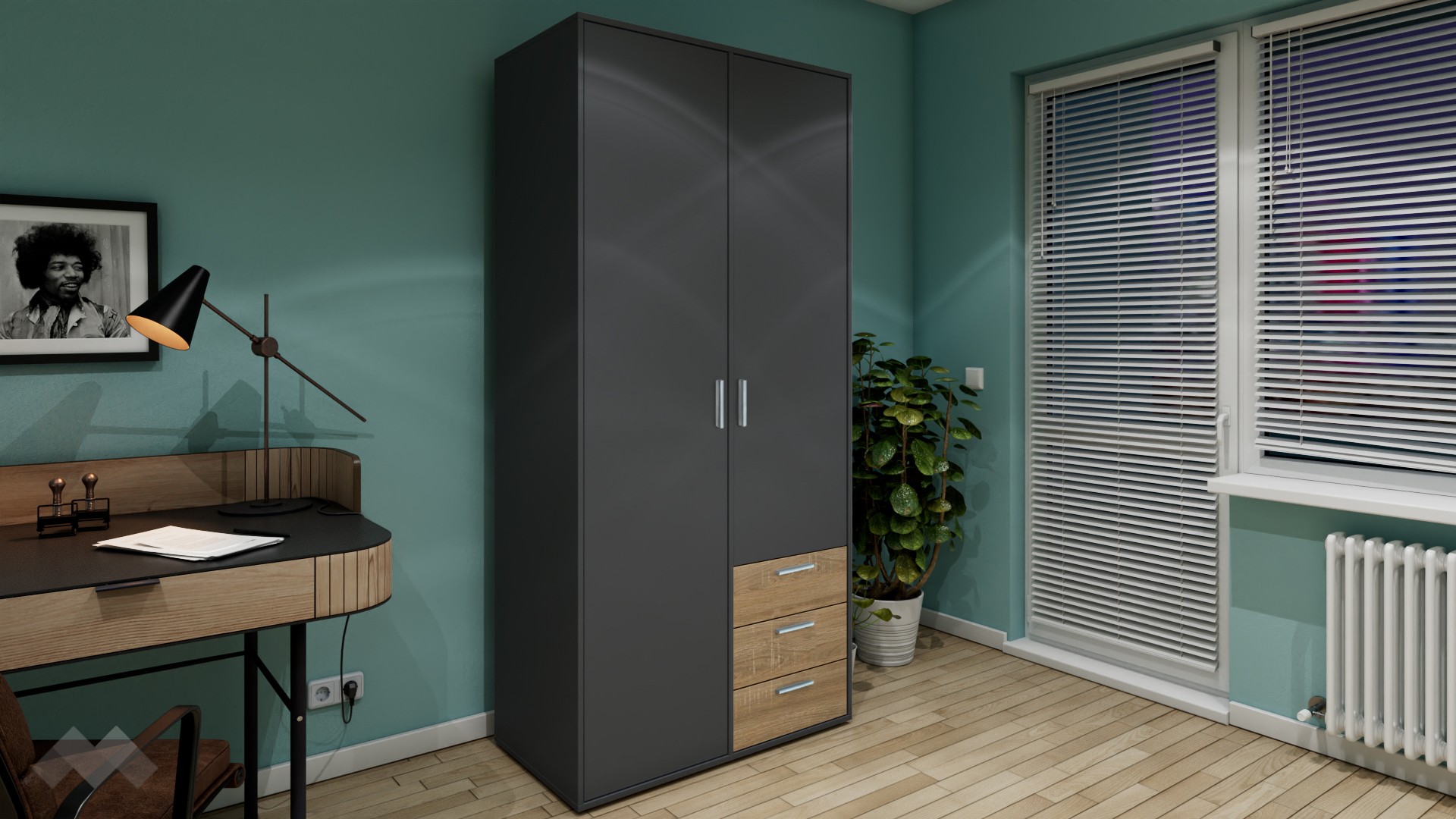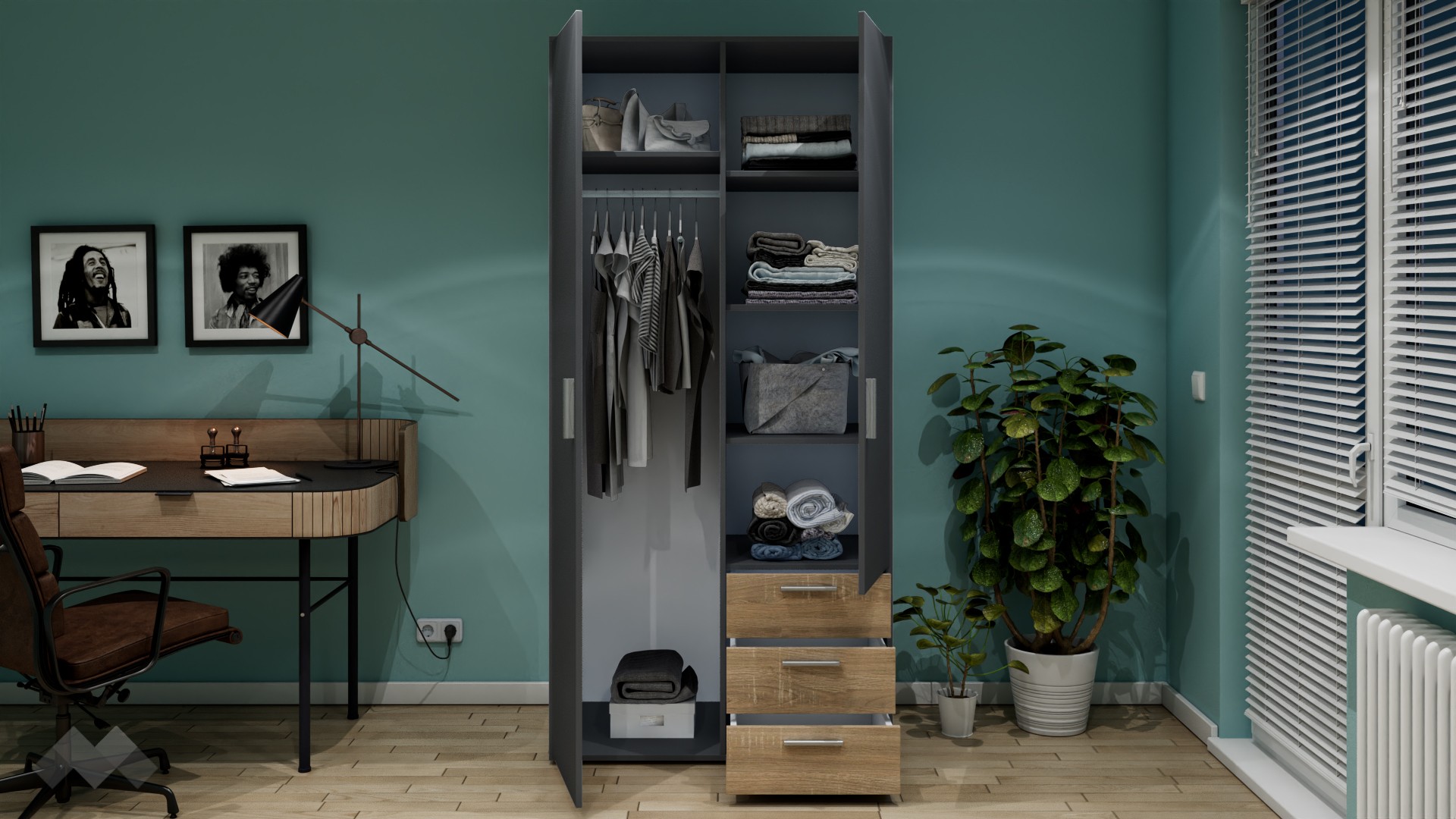 ⭐ Предимства: ✓ двукрилен ✓ 3 чекмеджета ✓ 4 рафта ✓ лост за закачалки ✓ модерен декор ✓ практично разпределение ✓ качествена изработка ✓ 16 мм ПДЧ