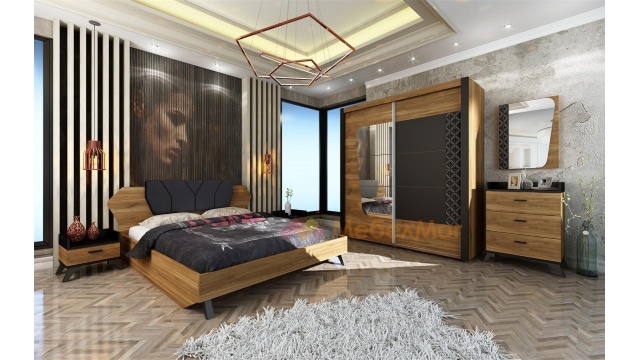 Спалнята ти предоставя удобство и комфорт за сън. Тя е подходяща за матрак с размер 160/200 см. Допълнителен ефект към визията придава тапицираната с черна еко кожа табла. Нощните шкафчета са много практични – разполагат с чекмедже и рафт – там ще откриеш място за всички най-необходими вещи.
