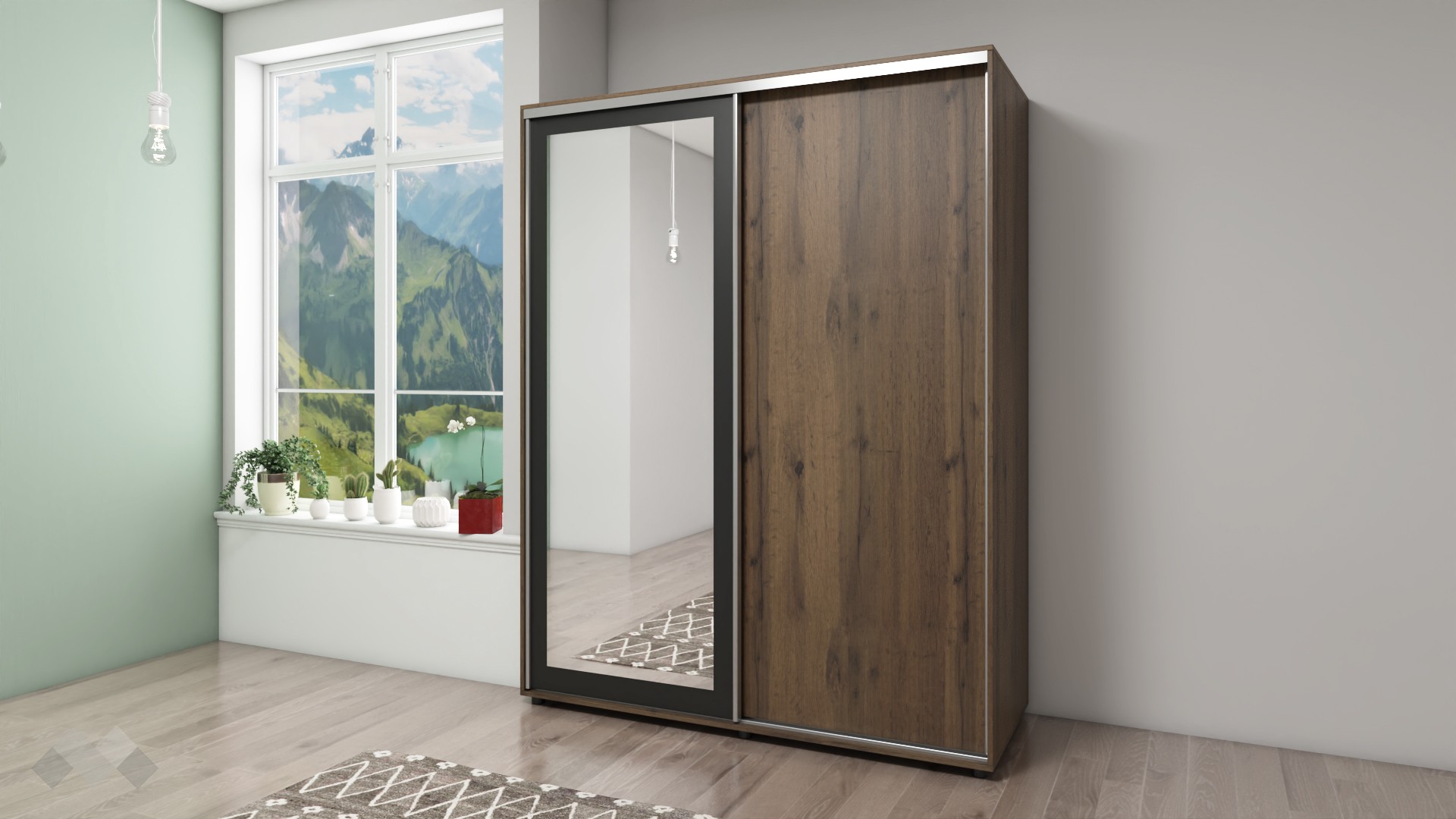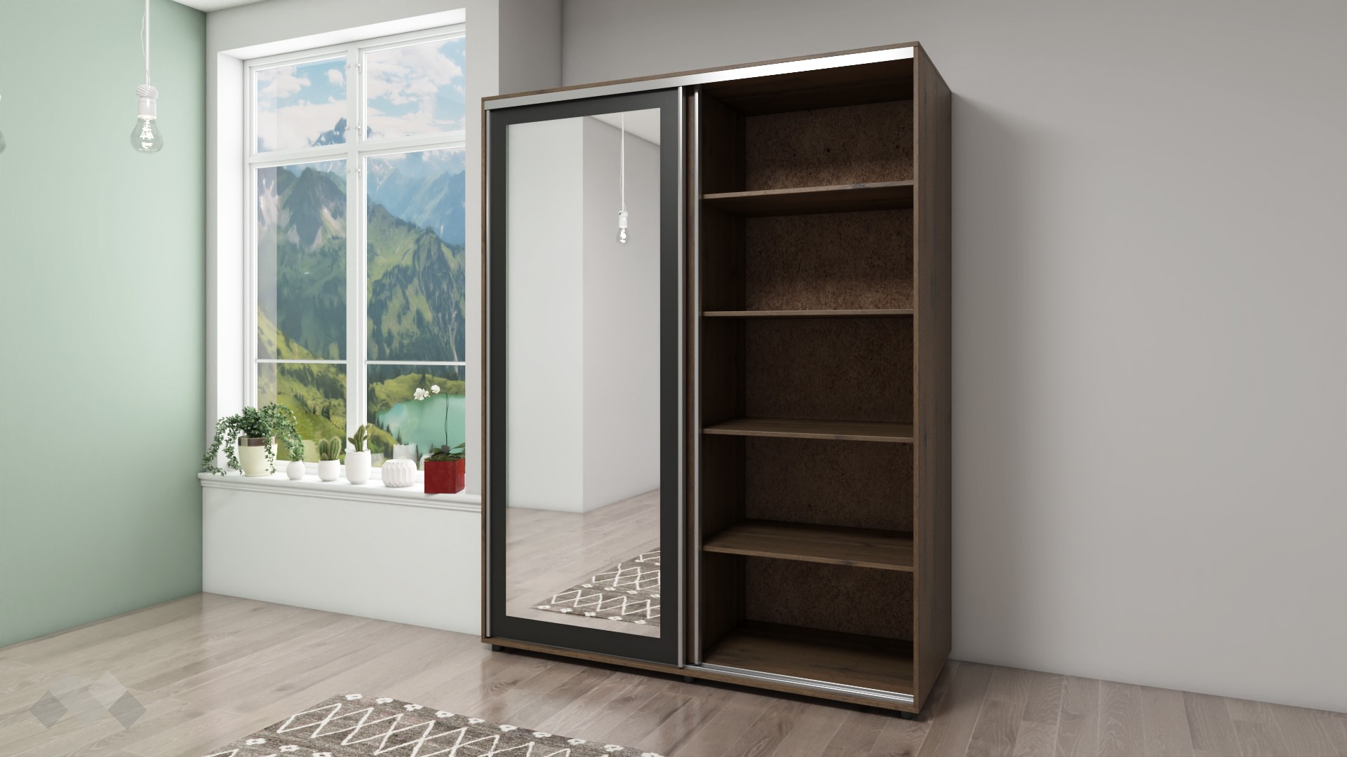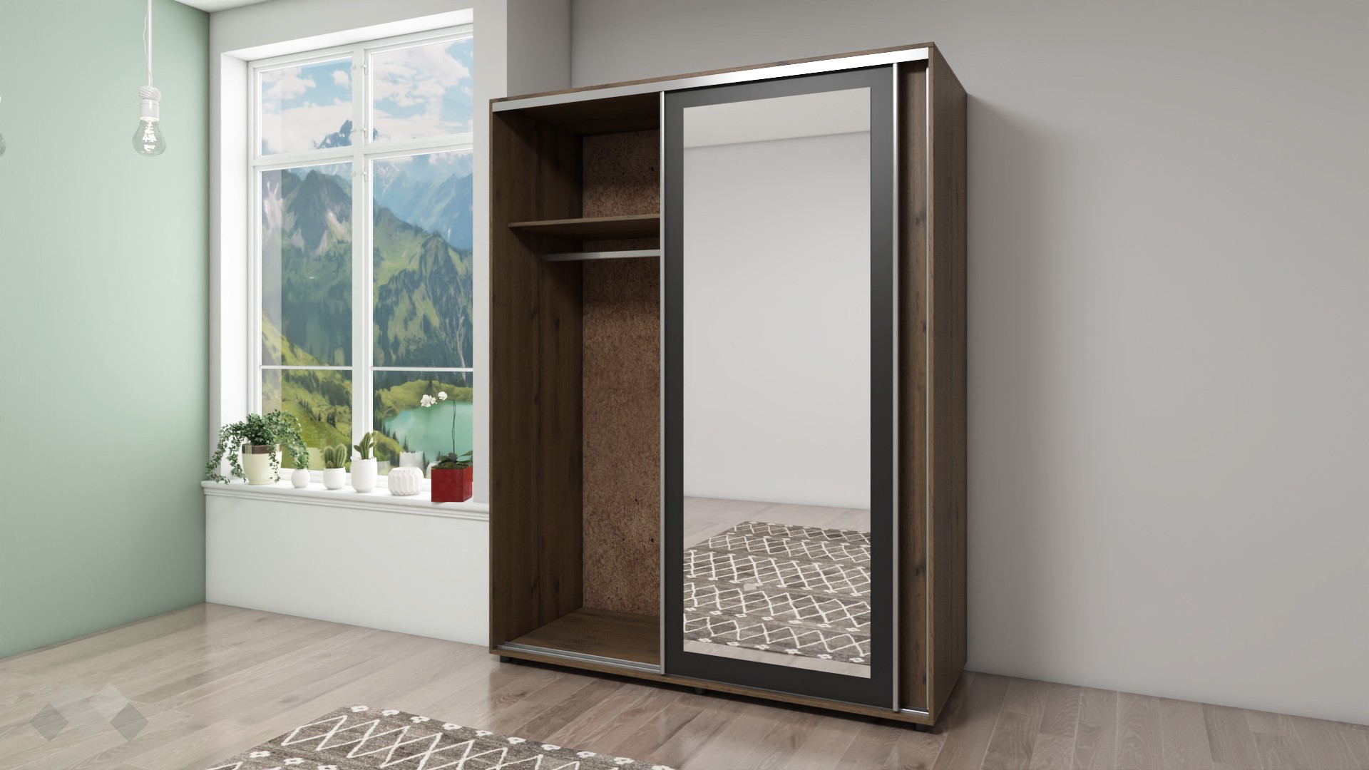 Той е двукрилен гардероб, който се отваря чрез плъзгащи врати. Модерният плъзгащ механизъм прави отварянето на вратите лесно, без да се тревожиш, че трябва да осигуряваш допълнително пространство пред самия гардероб. Щом ги отвориш, вътре ще откриеш четири големи рафта с оптимална височина, просторен лост за закачалки и рафт над него.