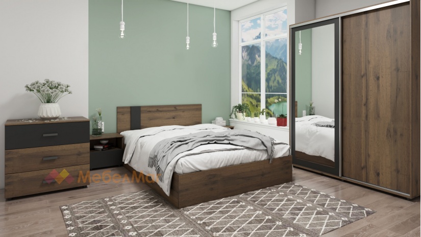 ✓ модерен декор ✓ гардероб с плъзгащи врати ✓ нощни шкафчета ✓ скрин ✓ качествена и прецизна изработка ✓ 16 мм ПДЧ