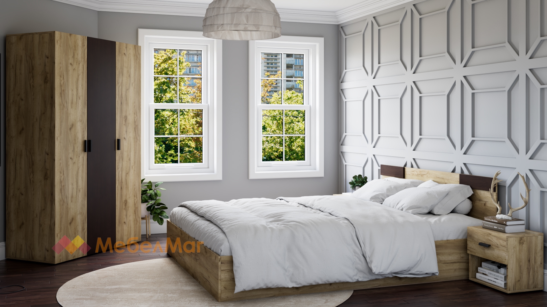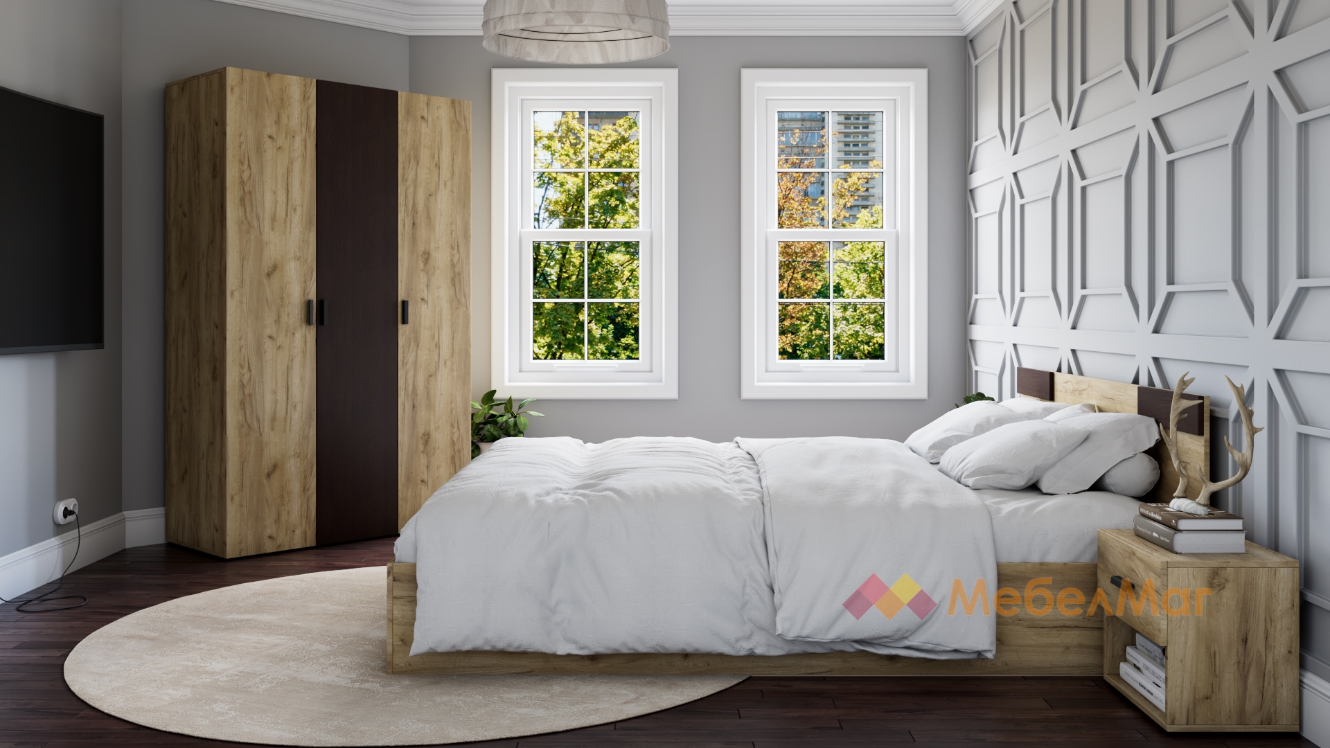 ⭐ Предимства: ✓ спалня ✓ две нощни шкафчета ✓ трикрилен гардероб ✓ модерен дизайн ✓ качествена изработка ✓ 15 мм ПДЧ