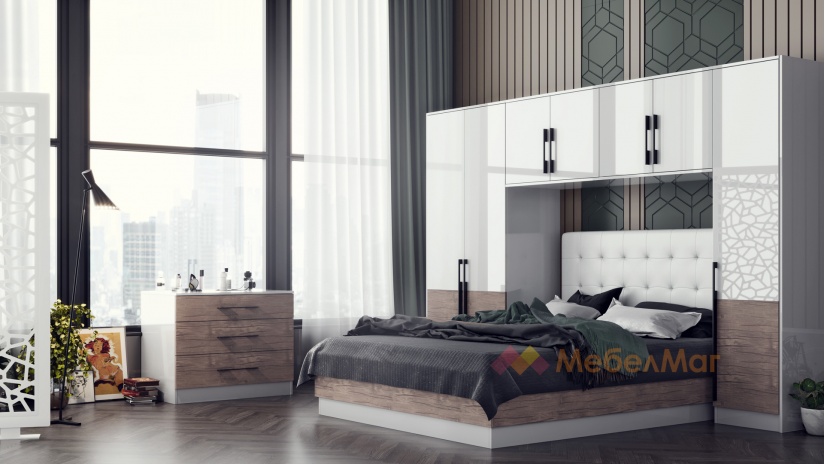Спален комплект Калифорния К5 е елегантен и практичен! Мебелите в комплекта ти дават възможност да организираш пространството в своята спалня съобразно нуждите и предпочитанията си. Белият гланц умело акцентира неутралния дървесен декор, за да придаде светлина и уют.