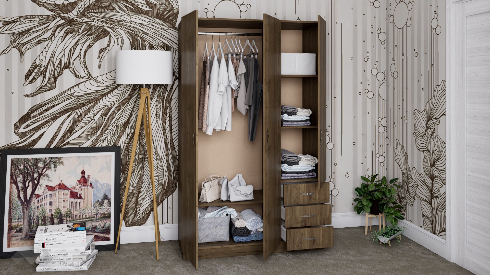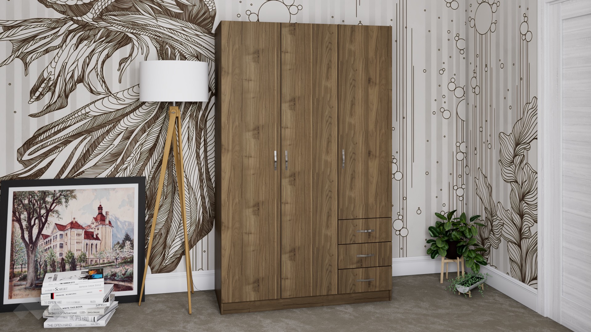 ⭐ Предимства: ✓ трикрилен ✓ 3 чекмеджета ✓ 3 рафта ✓ лост за закачалки ✓ механизъм за плавно затваряне ✓ модерен декор ✓ практично разпределение ✓ качествена изработка ✓ 16 мм ПДЧ