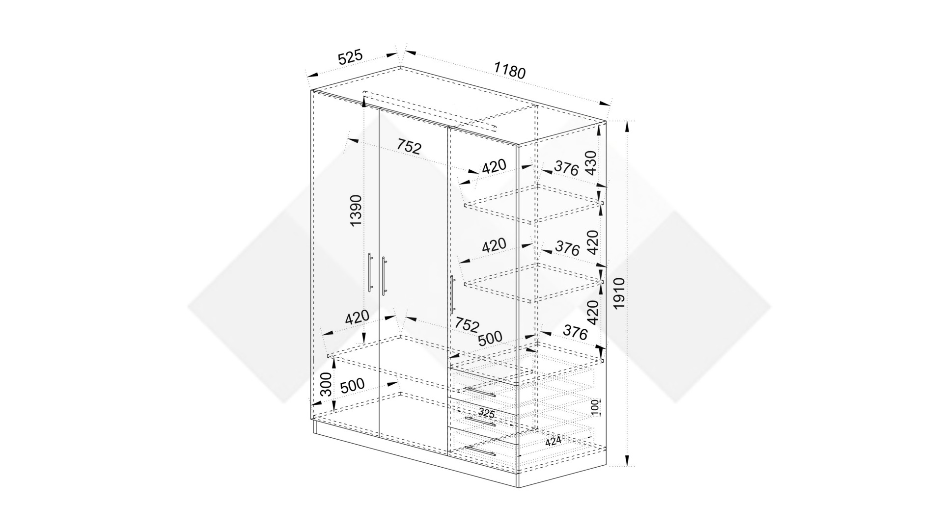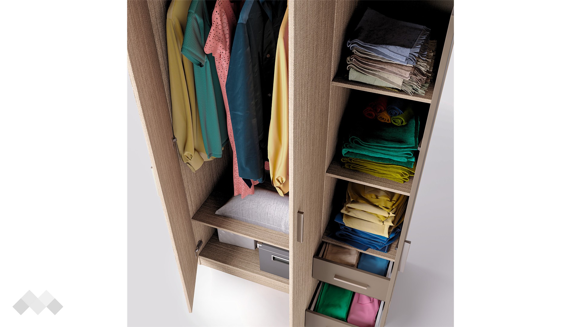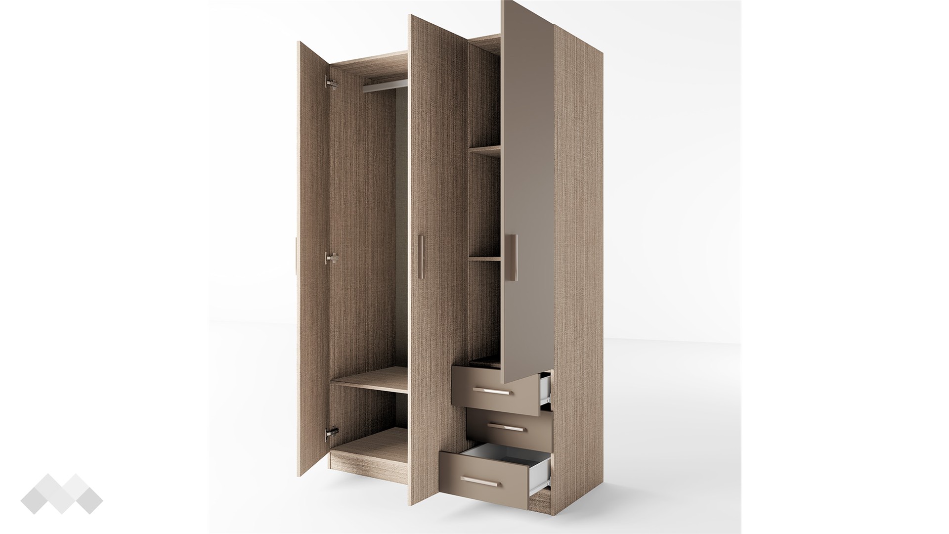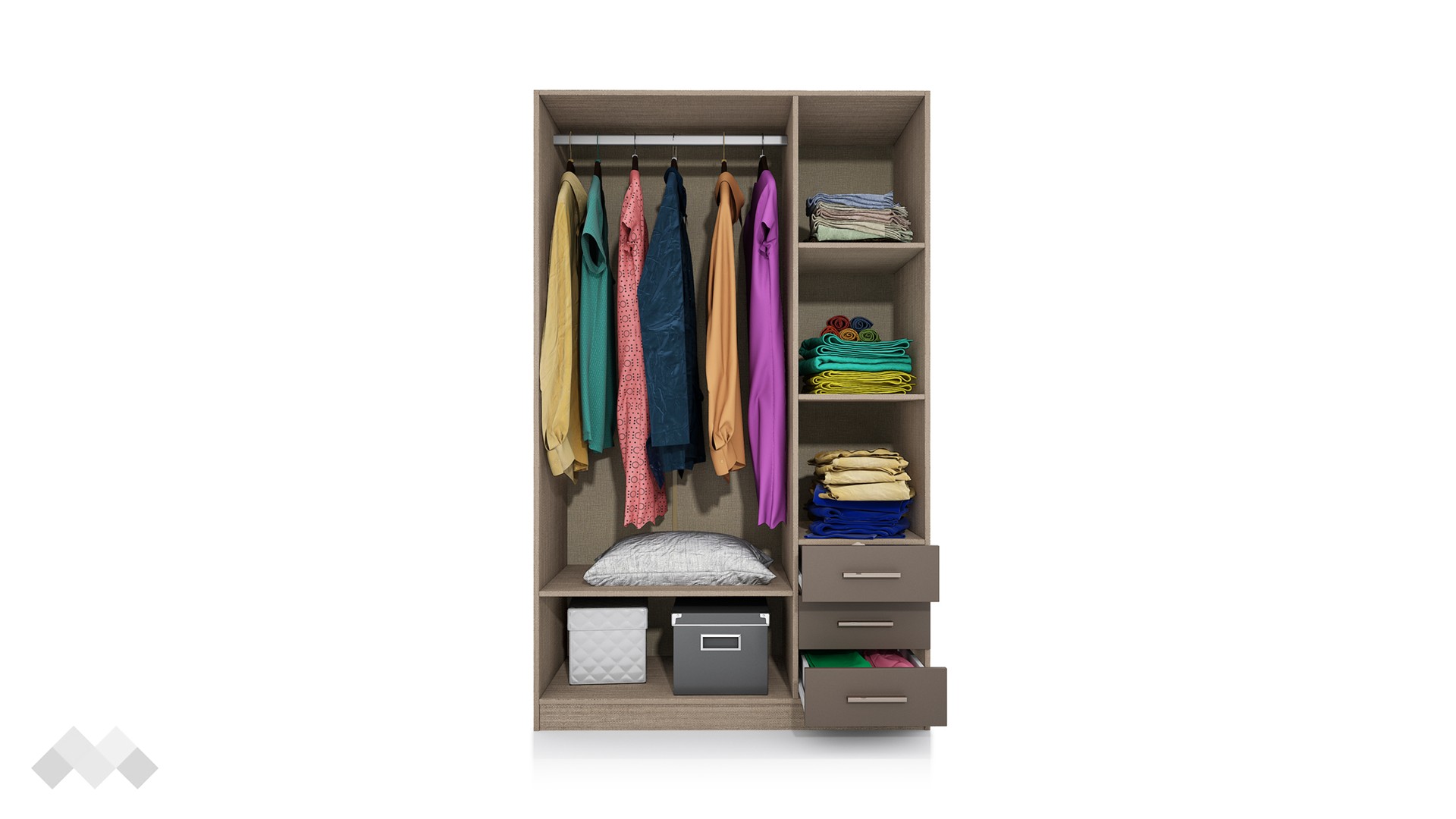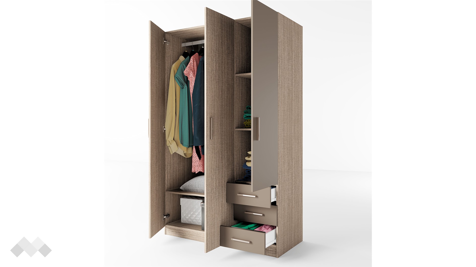 Зад дясното крило на гардероба се крият два рафта, на които можеш да разположиш сгънати дрехи, аксесоари или други необходими за теб вещи. За още по-голямо удобство сме добавили и три чекмеджета, подходящи за съхранение на бельо, чорапи, малки електрически уреди и дребни принадлежности. От лявата страна разполагаш с лост за закачалки, подходящ за елегантното облекло, което се мачка лесно. Под лоста ще откриеш още един широк рафт, където можеш да организираш възглавници, завивки, по-обемни пуловери или кутии за съхранение.