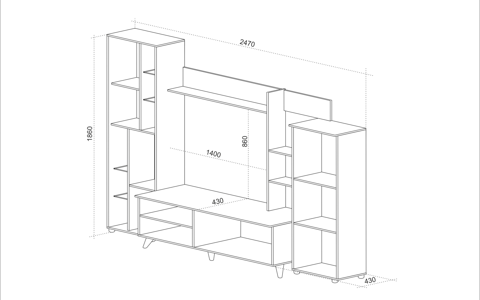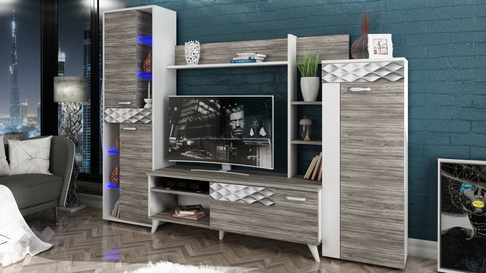 ТВ шкафът разполага с две отворени ниши и затворен шкаф, в които можеш да организираш цялата си съпътстваща техника като декодери, плеъри и конзоли. Красивите крачета, на които е поставен, допринасят за елегантната визия на секцията и ти осигуряват възможност да почистваш лесно пространството под него. Двата високи шкафа ти предоставят достатъчно място, където с лекота да аранжираш необходимите ти в ежедневието вещи. Високият шкаф от лявата страна разполага и с четири остъклени рафта, които са подходящи за красиви декорации, любими сувенири или скъпи фотографии. Отворените рафтове до мястото за телевизор и етажерката са идеални за подреждане на книги или украси.