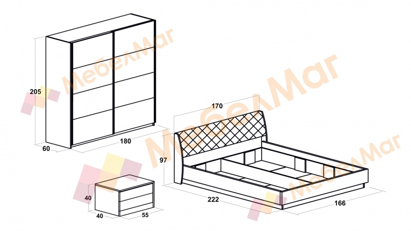 Спалня: Д: 222 см Ш: 170 см В: 97 см