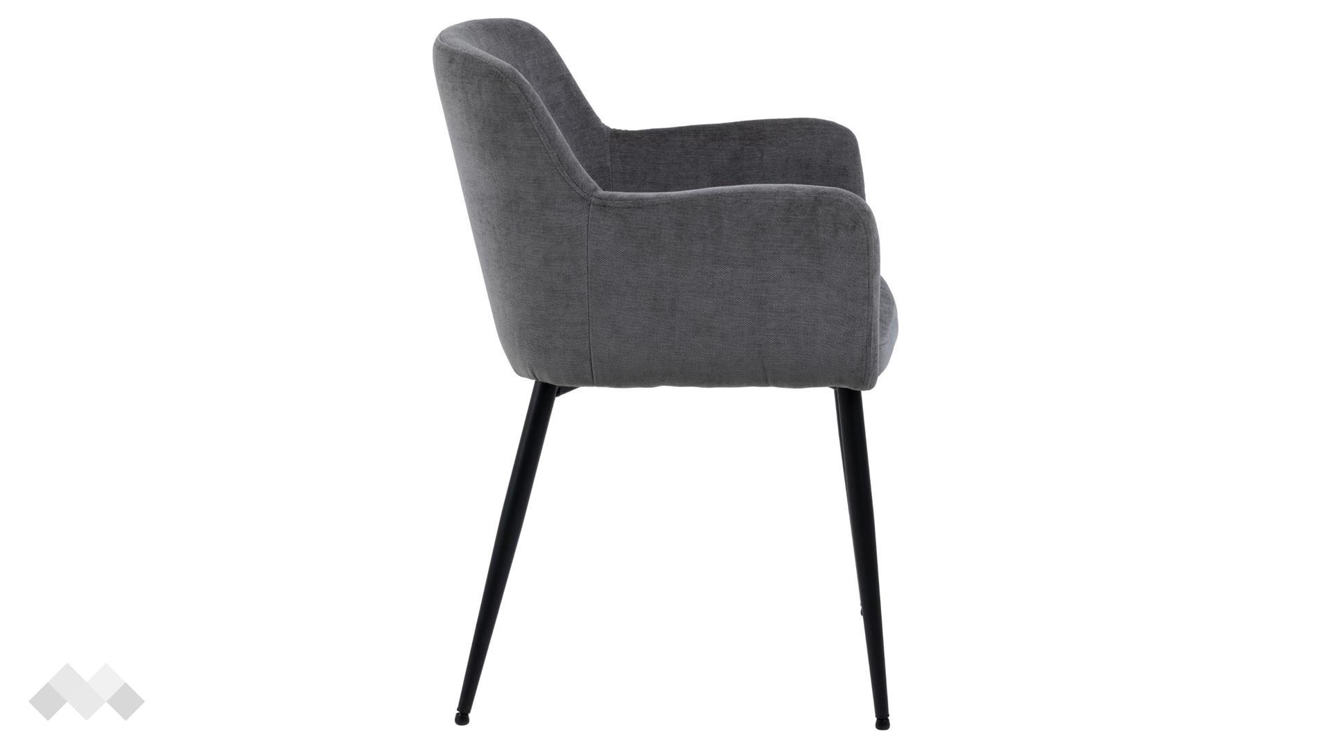 Трапезен стол Карън съчетава комфорт и съвременен стил, предлагайки ергономичен и елегантен дизайн. Текстилната дамаска е мека и устойчива, осигуряваща приятно усещане при седене, а подлакътниците допълват удобството.