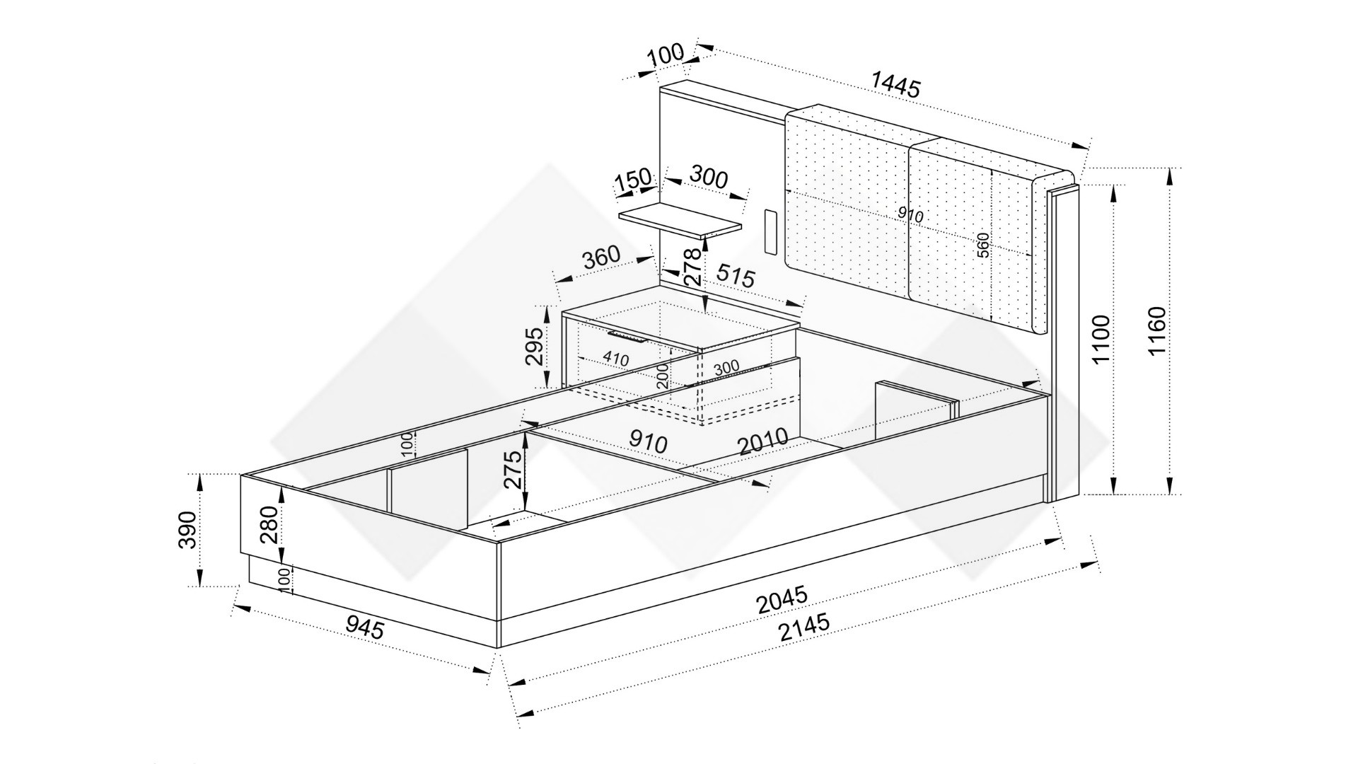 ✓ 16 мм ПДЧ ✓ тапицирана табла ✓ чекмедже ✓ рафт ✓ LED осветление ✓ механизъм за повдигане на матрака ✓ за матрак 90/200 ✓ модерен дизайн ✓ качествена изработка