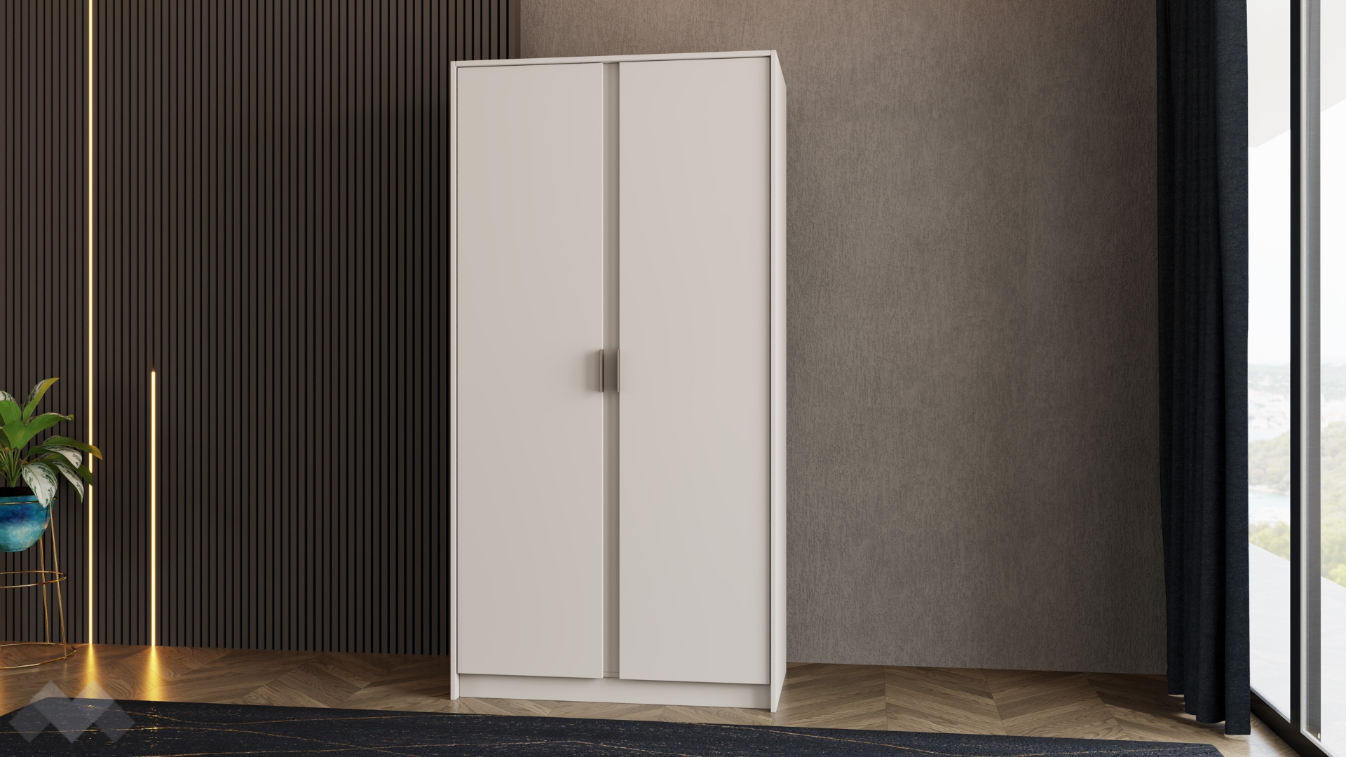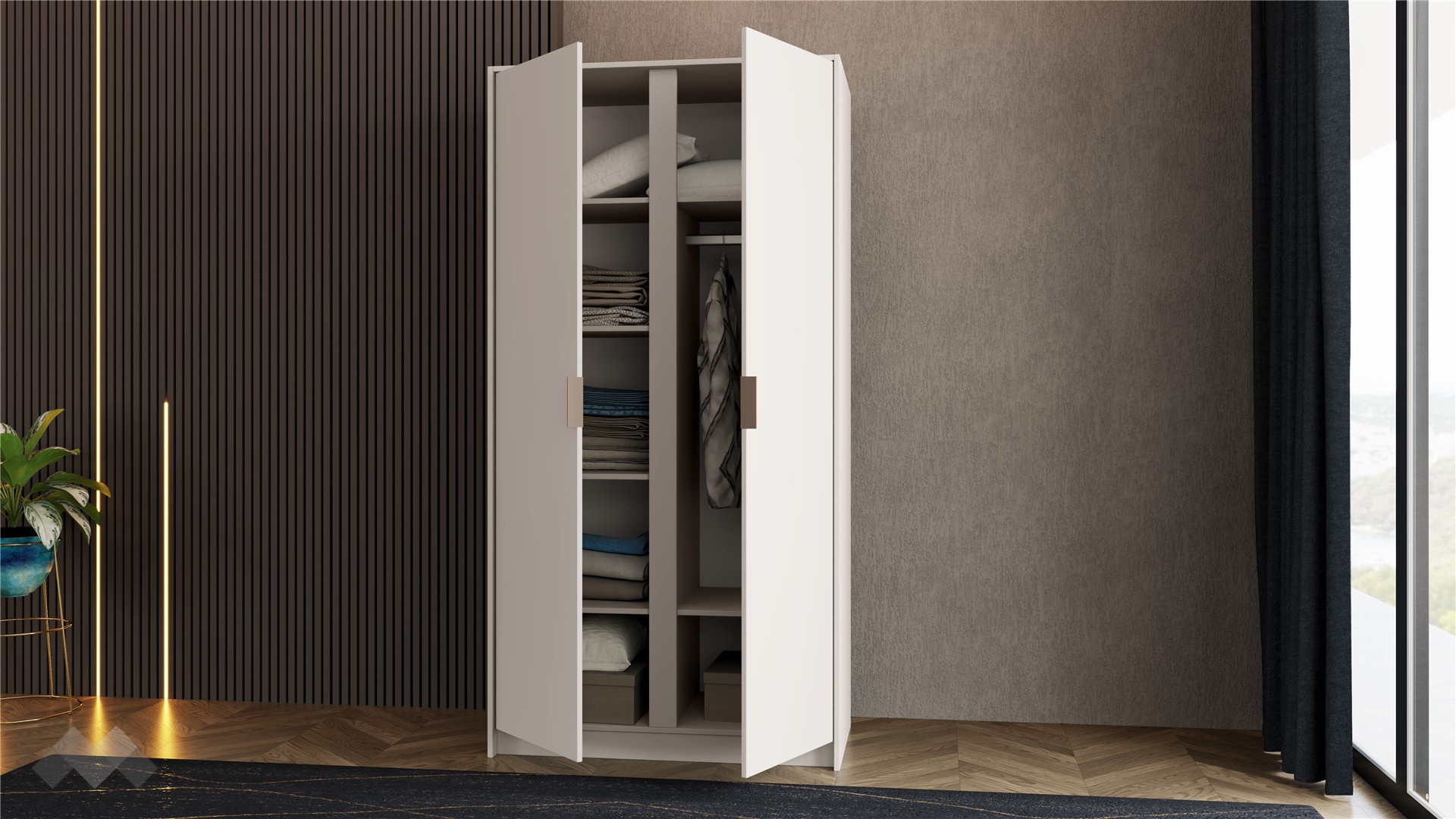 Двукрилният гардероб Кашмир е практично и стилно решение за всеки дом, което предлага достатъчно пространство за подредба на дрехи и аксесоари, без да заема излишно място.