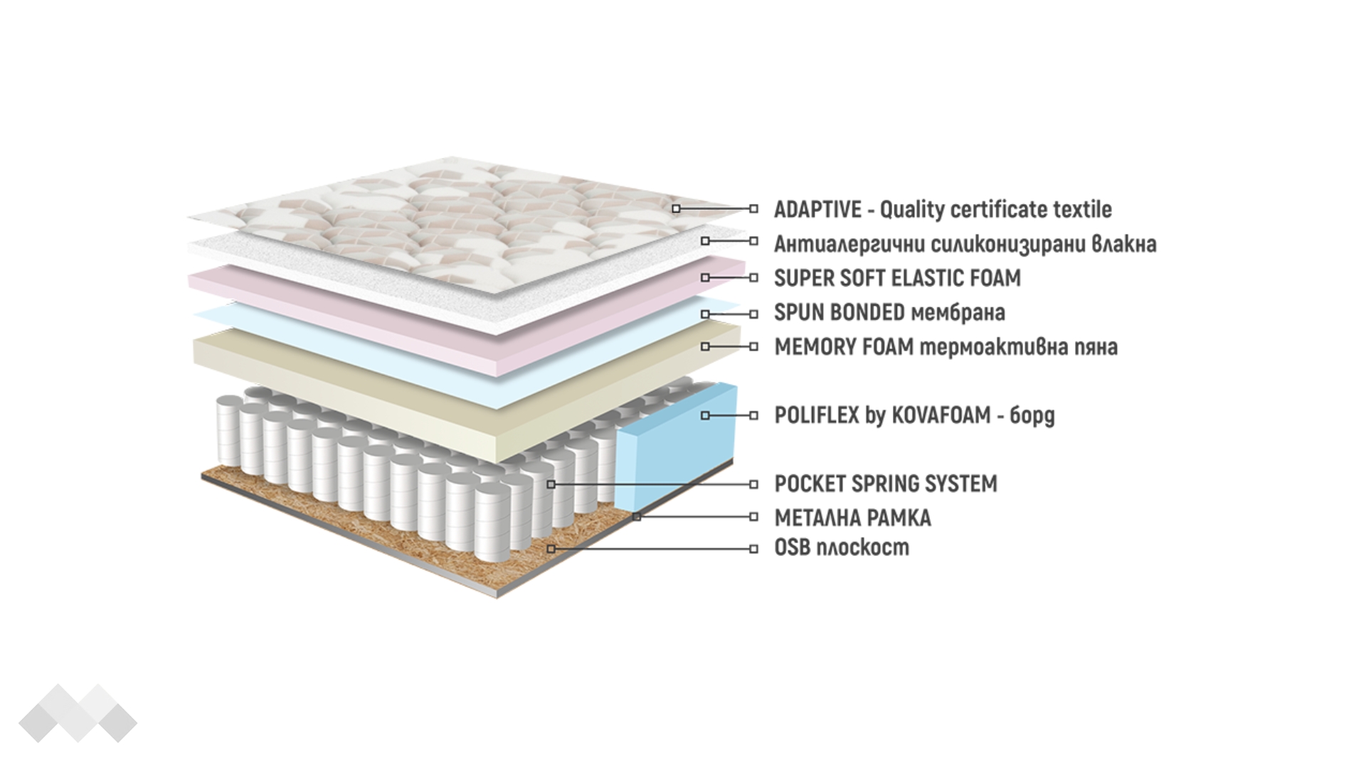 ⭐Предимства: ✓ Еднолицев матрак с вградена метална рамка ✓ OSB плоскостOSB плоскост ✓ Многозоново ядро от покет пружини и термоактивна Memory пяна ✓ Ергономичен и ортопедичен ✓ Антибактериалna дамаска ✓ Висококачествен сертифициран текстил ✓ Степен на твърдост - балансиран ✓ Височина: 22 см ✓ Натоварване: 110 кг за единичен размер ✓ Степен на твърдост: Средно твърд ✓ Гаранция: 60 месеца