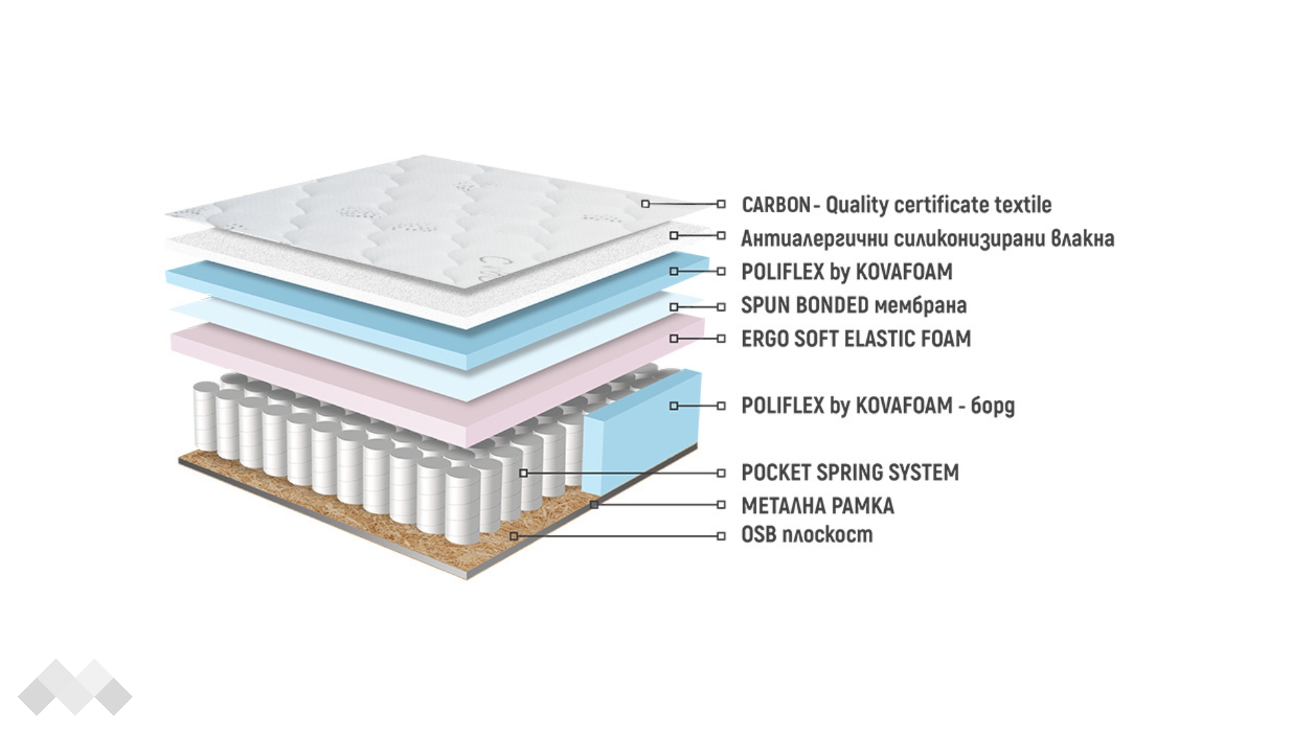 ⭐Предимства: ✓ Еднолицев с вградена метална рамка и OSB плоскост ✓ Ортопедичен модел с Pocket пружини, защитени от Polyflex борд ✓ Слой ERGO SOFT ELASTIC FOAM ✓ Средно ниво на твърдост ✓ Антибактериален и дишащ ✓ Качествен калъф, комфортен през всеки сезон ✓ Подходящ за използване с повдигащ механизъм ✓ Степен на твърдост - балансиран ✓ Височина: 20 см ✓ Натоварване: 110 кг за единичен размер ✓ Степен на твърдост: Средно твърд ✓ Гаранция: 60 месеца