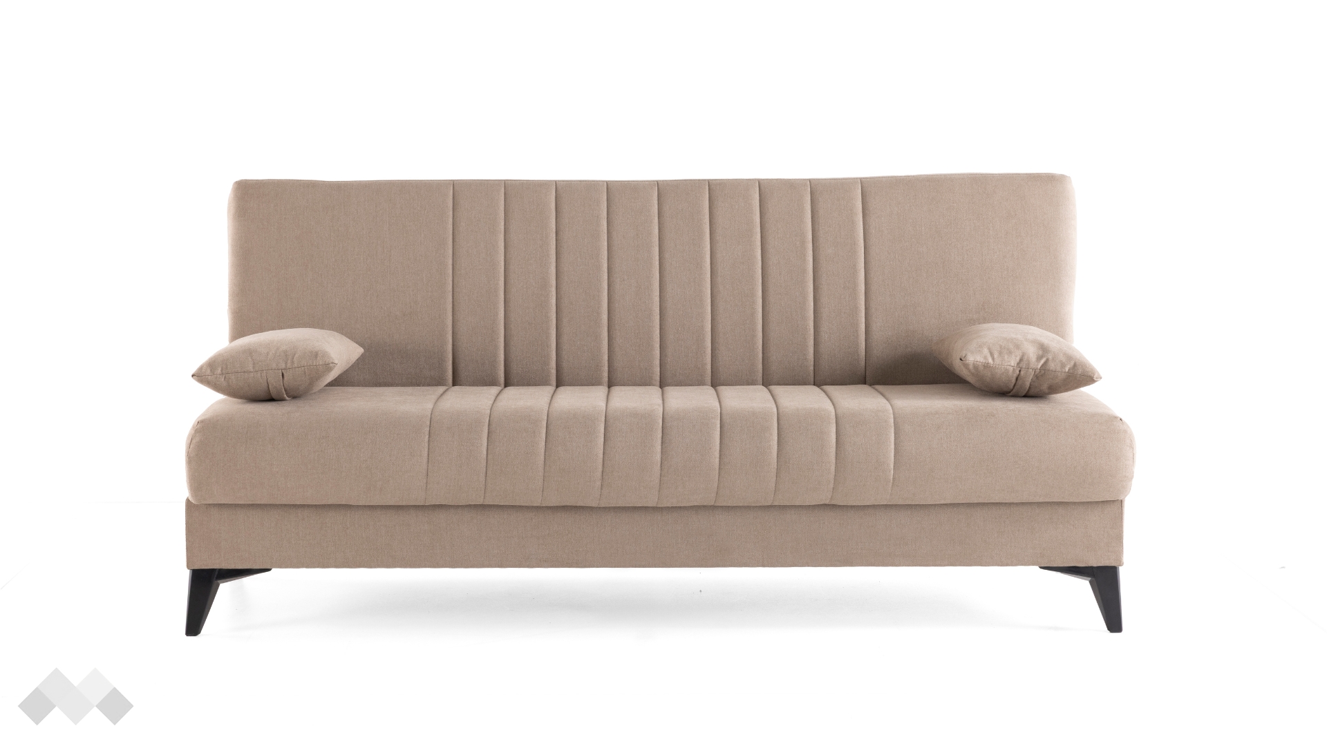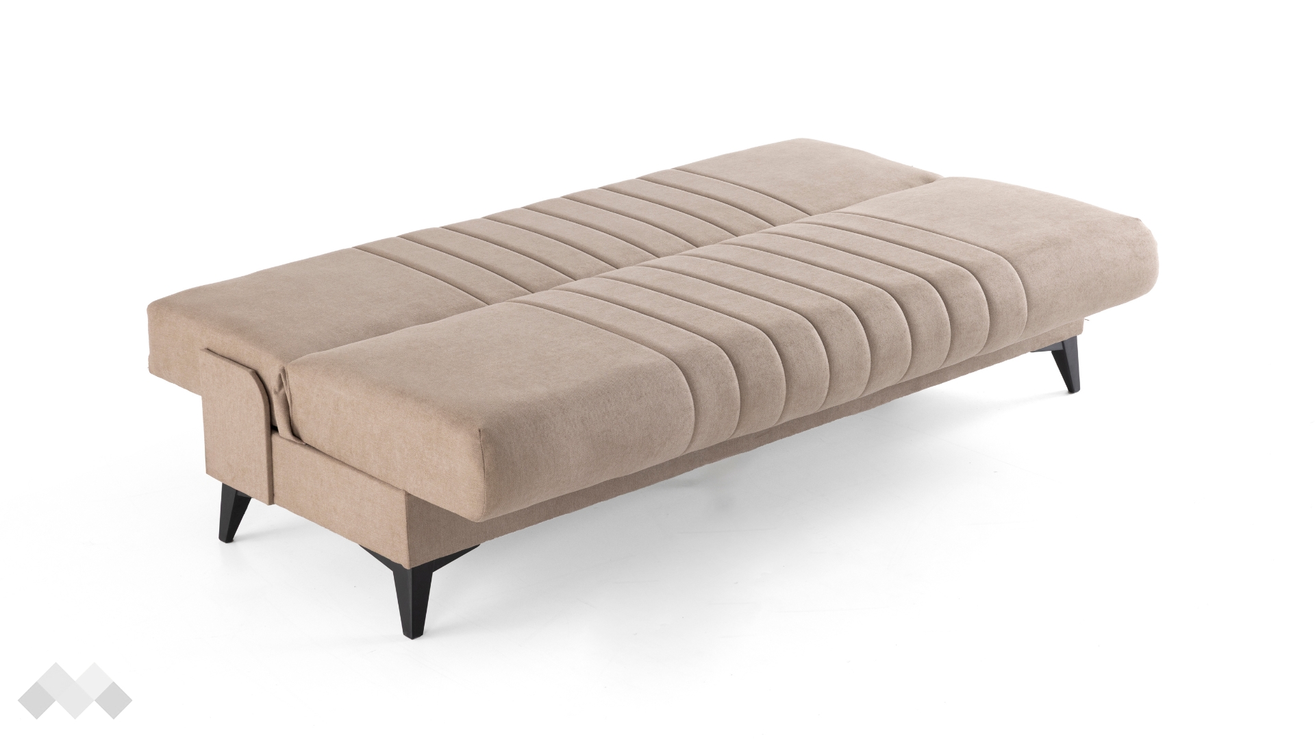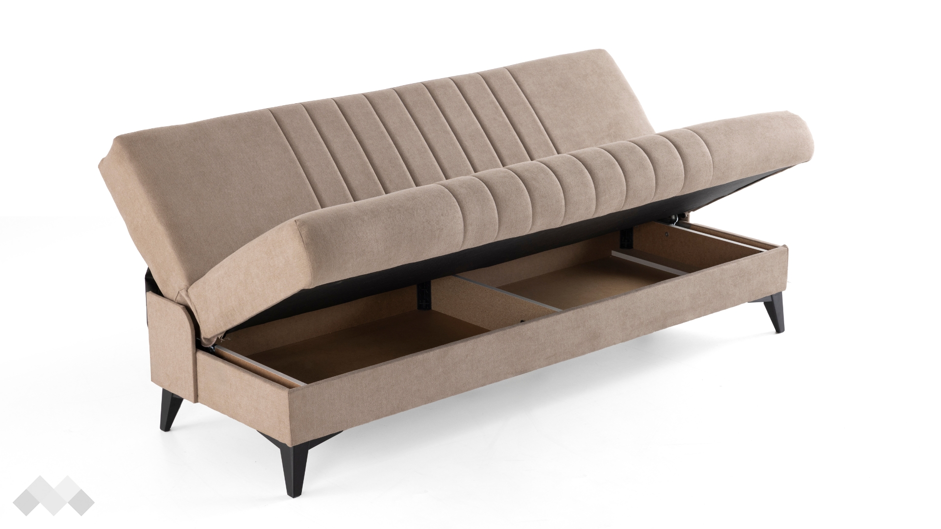 Подлакътниците са оформени с възглавници, които лесно се отстраняват при нужда, за да разширят използваемата площ. Това прави канапето още по-функционално и удобно при посрещане на гости или при необходимост от кратка почивка през деня. Просторната ракла под седалката осигурява допълнително място за съхранение на спално бельо, завивки и други вещи.