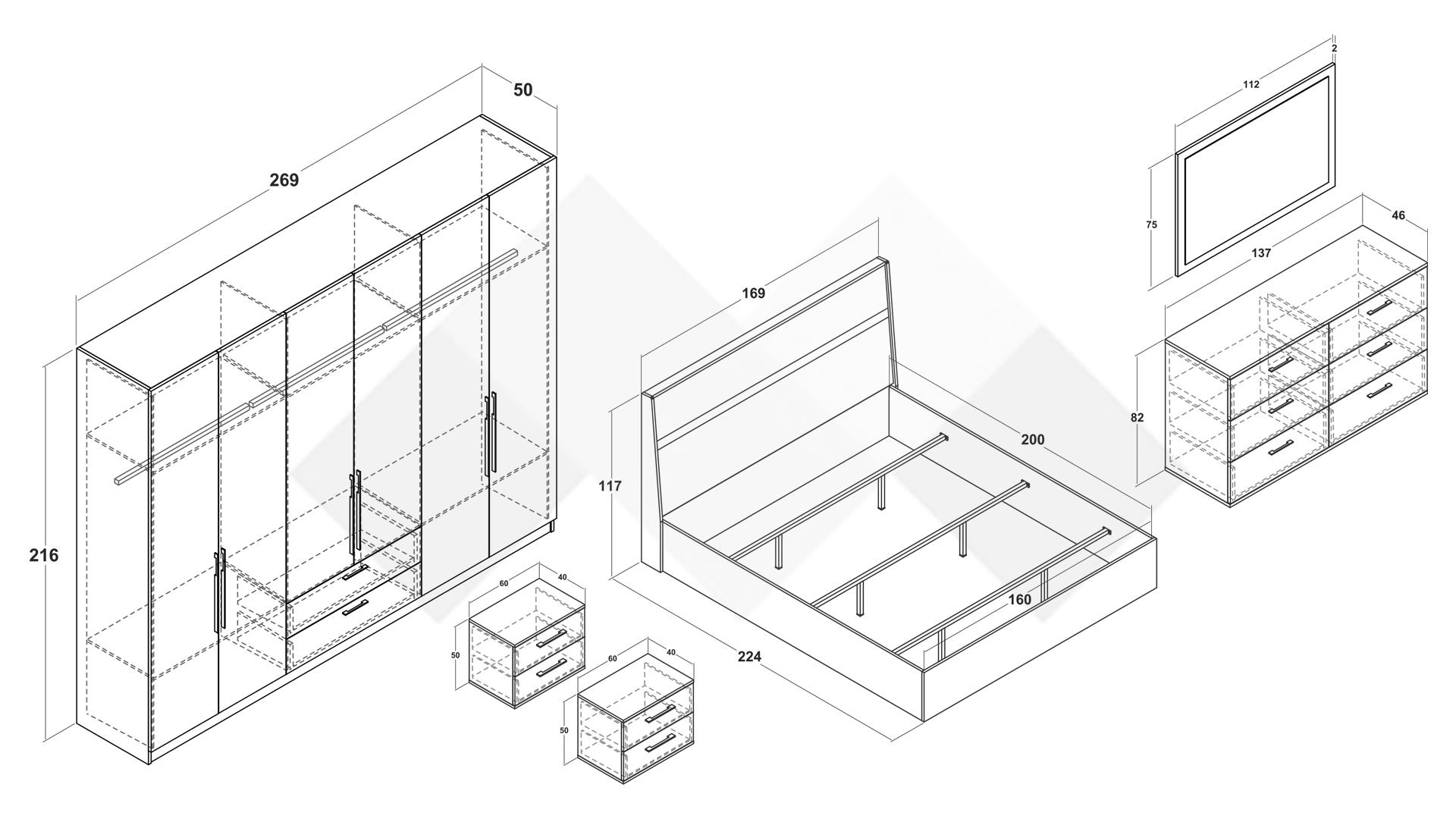 ✓ 18 мм ПДЧ ✓ спалня за матрак 160/200 ✓ нощен шкаф 2 бр. ✓ 2 чекмеджета ✓ скрин ✓ 6 чекмеджета ✓огледало ✓ шесткрилен гардероб ✓ 5 рафта ✓ 3 лоста за закачалки ✓ 2 чекмеджета ✓ плавно затваряне на вратите ✓ модерен декор ✓ качествена изработка