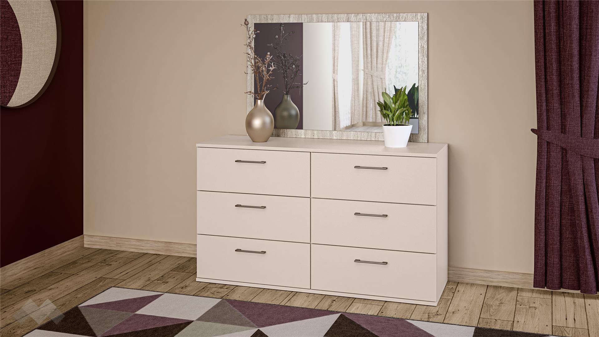 Скринът ти предоставя шест чекмеджета, в които да съхраниш както бельо и дрехи, така и малки уреди или козметика. Плотът е достатъчно просторен, за да подредиш върху него декорация или козметиката си и в комбинация с огледалото да го превърнеш в своето кътче за разкрасяване.
