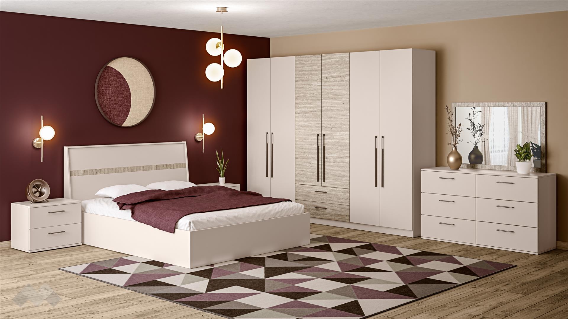 Спалнята е подходяща за матрак с размер 160/200. Високата табла е идеална за разпускане преди сън. Изчистеният дизайн и фините детайли създават спокойна и елегантна атмосфера, подходяща както за класически, така и за съвременни интериори.