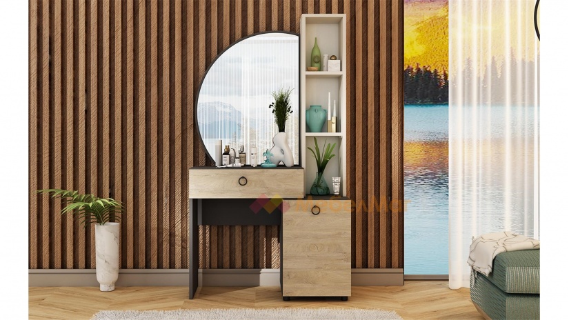 Със скрин-тоалетката ще разполагаш с етажерка с отворени рафтове, чекмедже и шкаф с вратичка. На отворените рафтове можеш да разположиш козметиката, любимите парфюми и бижута, а в шкафовете да подредиш други вещи, които искаш да са ти под ръка в ежедневието. Модерното огледало ще разкраси интериора на стаята ти и ще ти помогне за поддържане на перфектен външен вид. Моделът е снабден с механизми за плавно затваряне на вратичките.