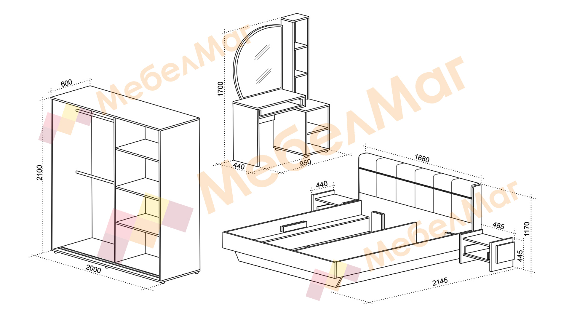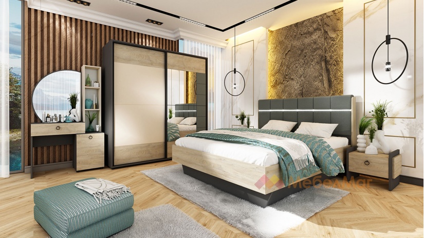 ✓ спалня с тапицирана табла ✓ 2 нощни шкафчета ✓ гардероб с плъзгащи врати ✓ огледало ✓ скрин-тоалетка ✓ LED осветление ✓ модерен дизайн ✓ качествена изработка ✓16 мм ПДЧ