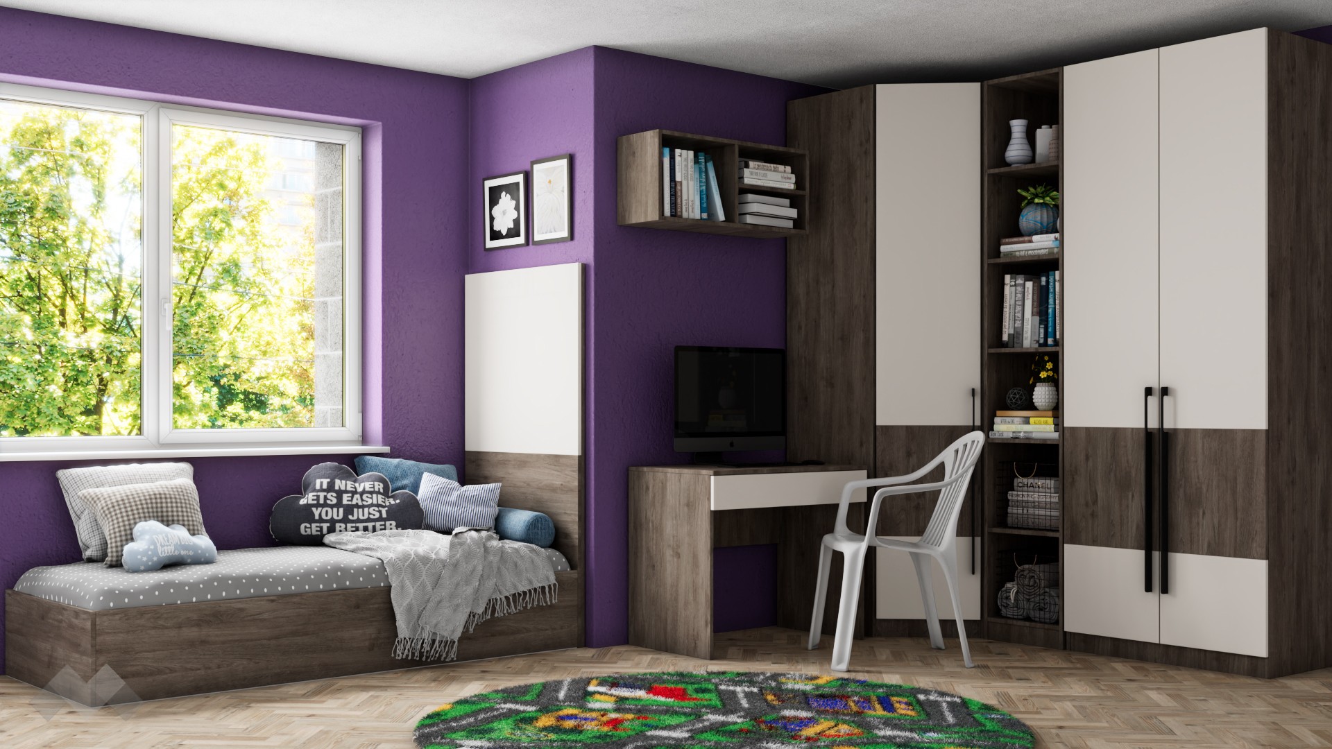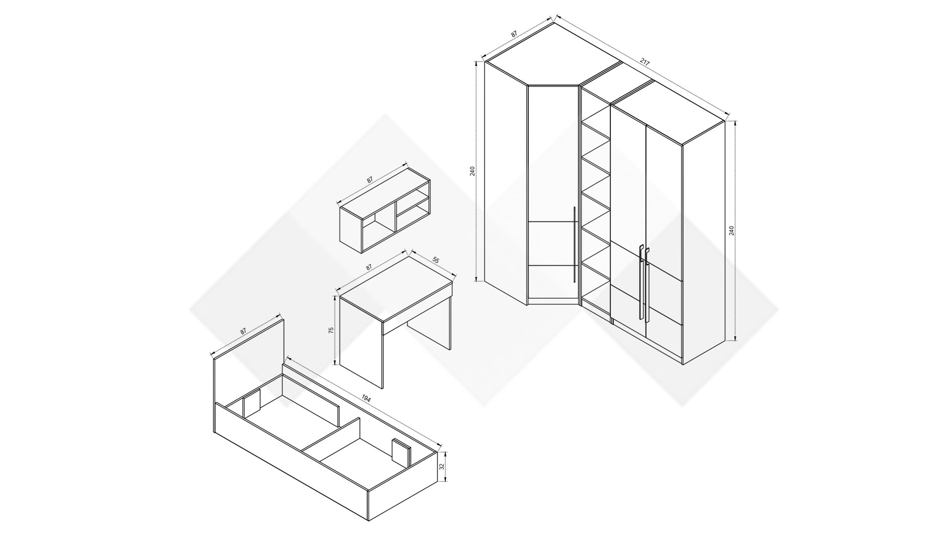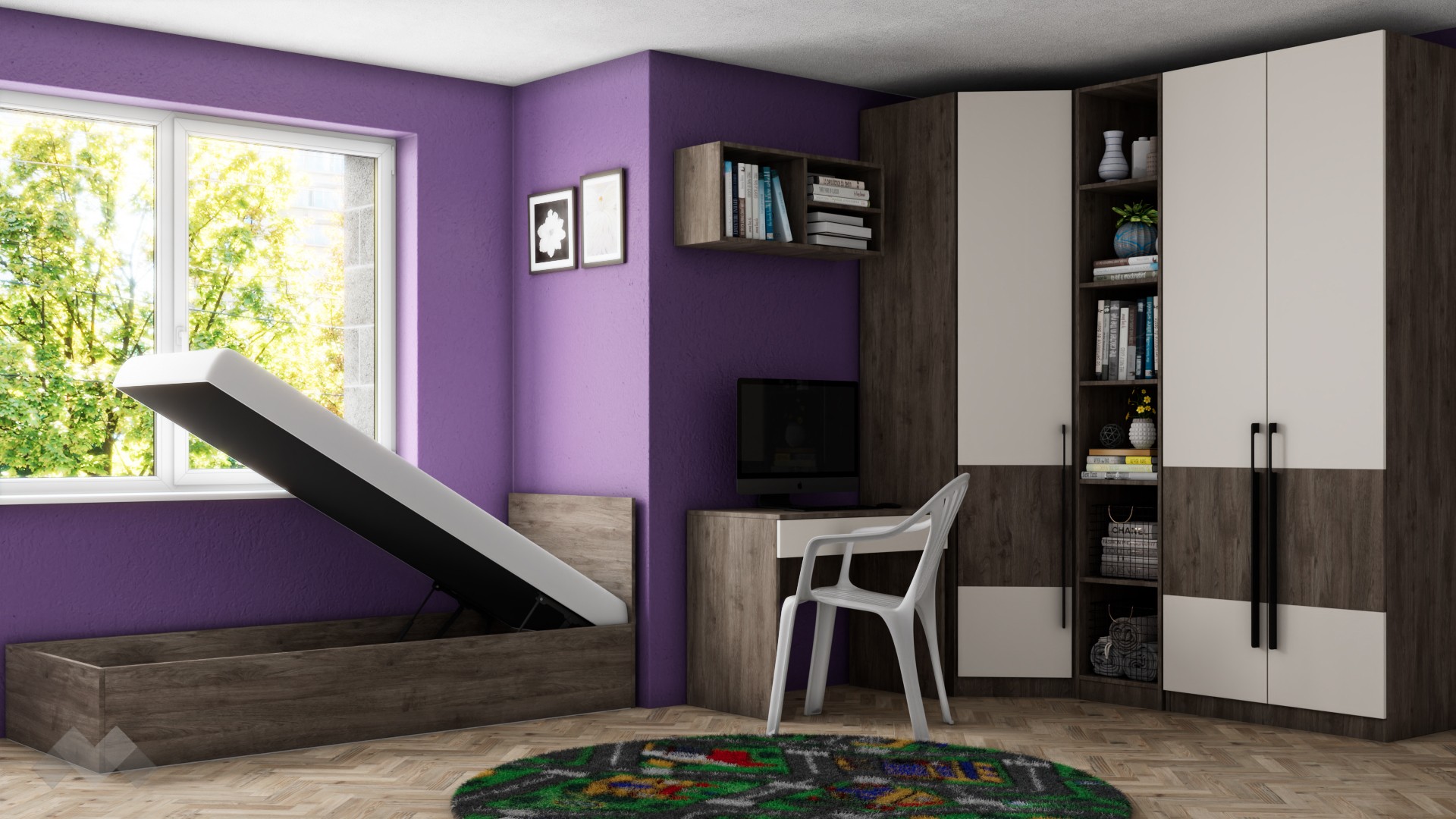 Ъгловият гардероб е снабден с четири рафта и два лоста за закачалки , а двукрилният гардероб разполага с два рафта и лост за закачалки, което ще ти позволи да подредиш добре всичките си дрехи и аксесоари. Любимите си книги, скъпи спомени като сувенири и фотографии, които искаш да ти бъдат винаги под ръка, можеш да подредиш върху петте открити рафта на високия шкаф етажерка.