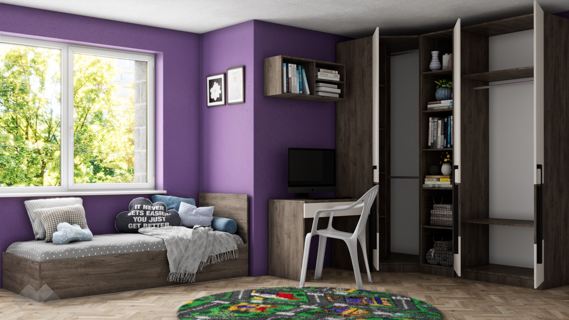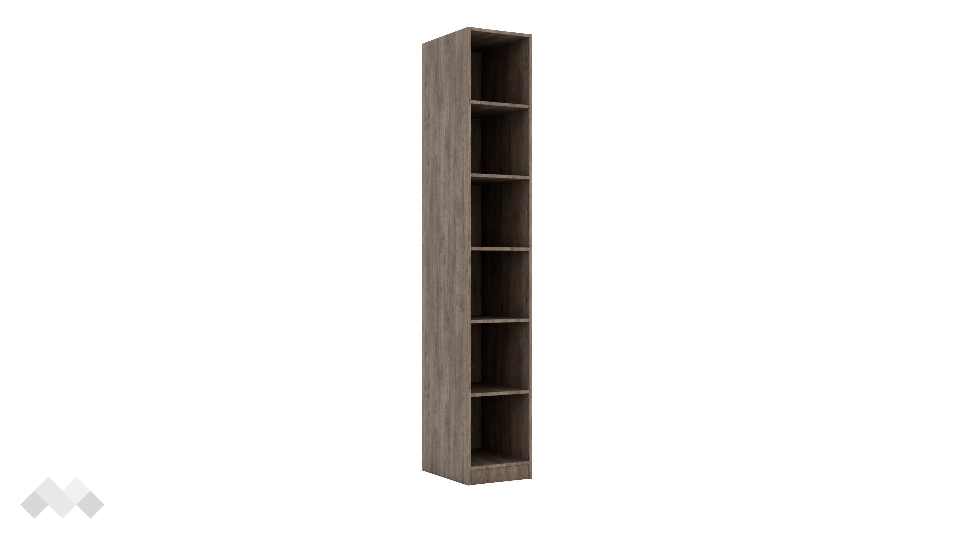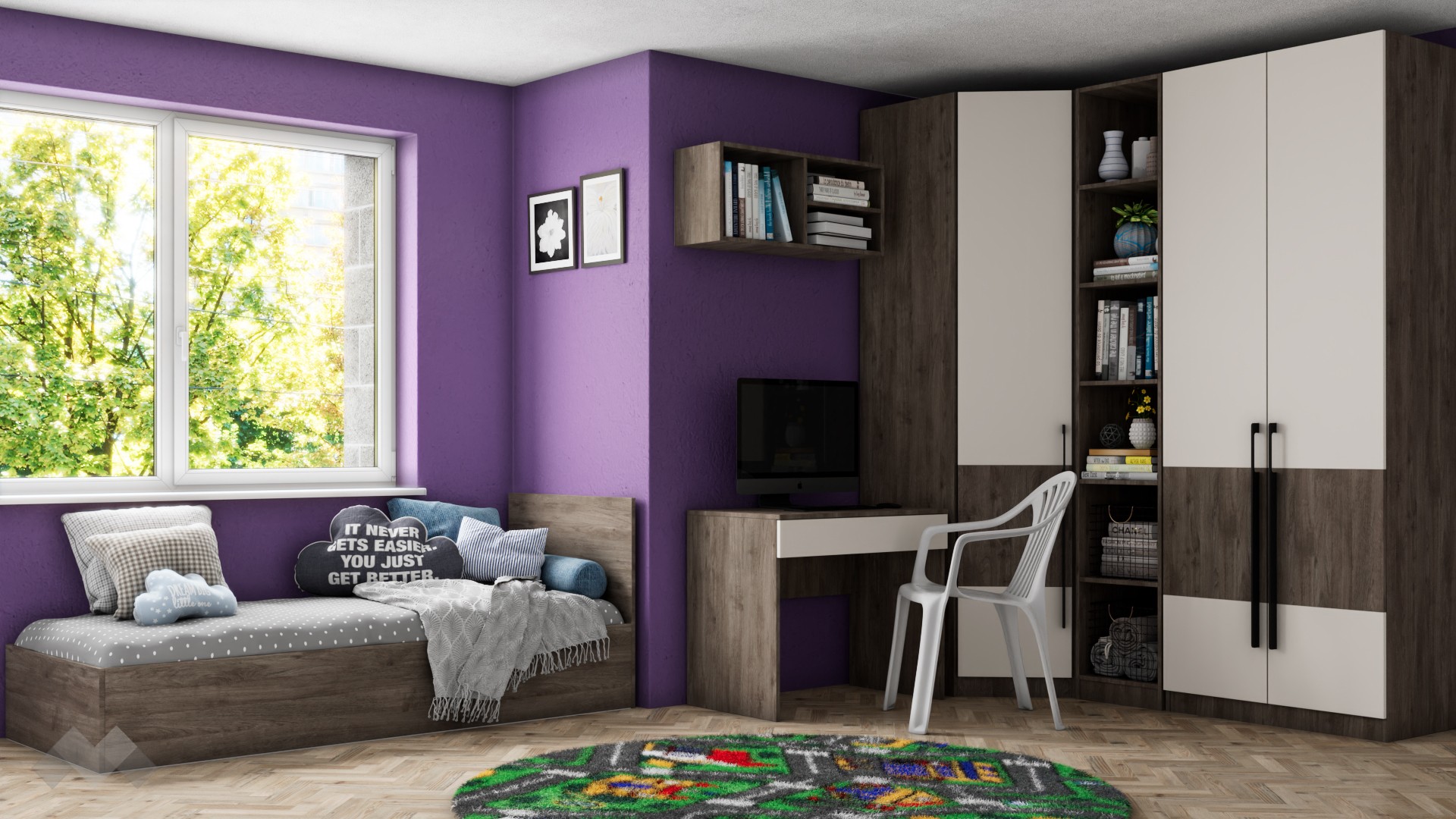 Ъгловият гардероб е снабден с четири рафта и два лоста за закачалки , а двукрилният гардероб разполага с два рафта и лост за закачалки, което ще ти позволи да подредиш добре всичките си дрехи и аксесоари. Любимите си книги, скъпи спомени като сувенири и фотографии, които искаш да ти бъдат винаги под ръка, можеш да подредиш върху петте открити рафта на високия шкаф етажерка.