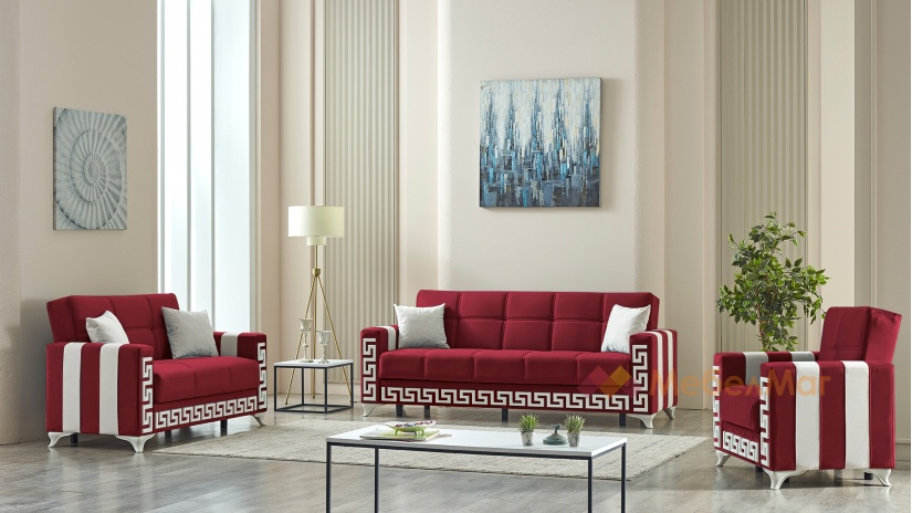 Комплектът се състои от триместен диван, малък диван и фотьойл селегантен дизайн, съзададени да паснат във всеки хол или всекидневна и да внесат уют и стил в дома.