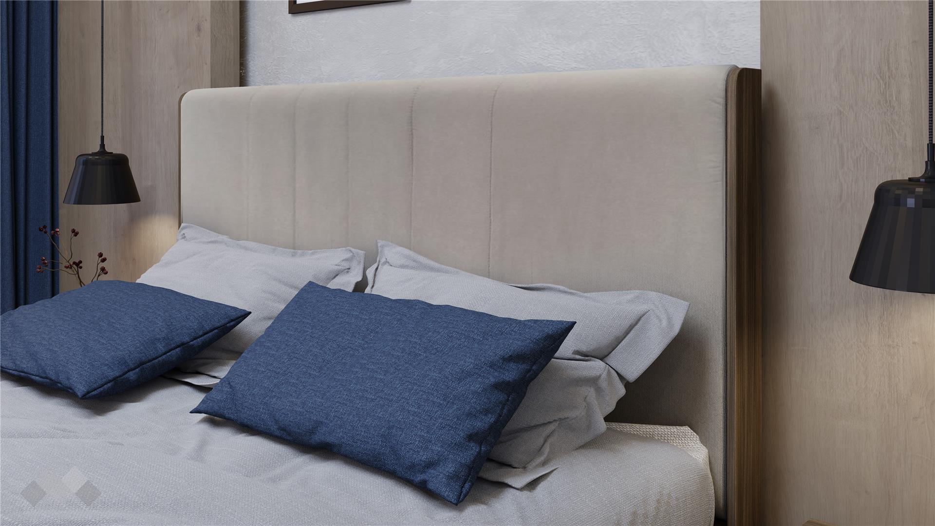Спалнята е подходяща за матрак с размери 160/200 см и осигурява комфортна височина за сядане и почивка. Стилната тапицирана табла допринася за завършен и елегантен облик, като същевременно осигурява удобство при четене или отмора.