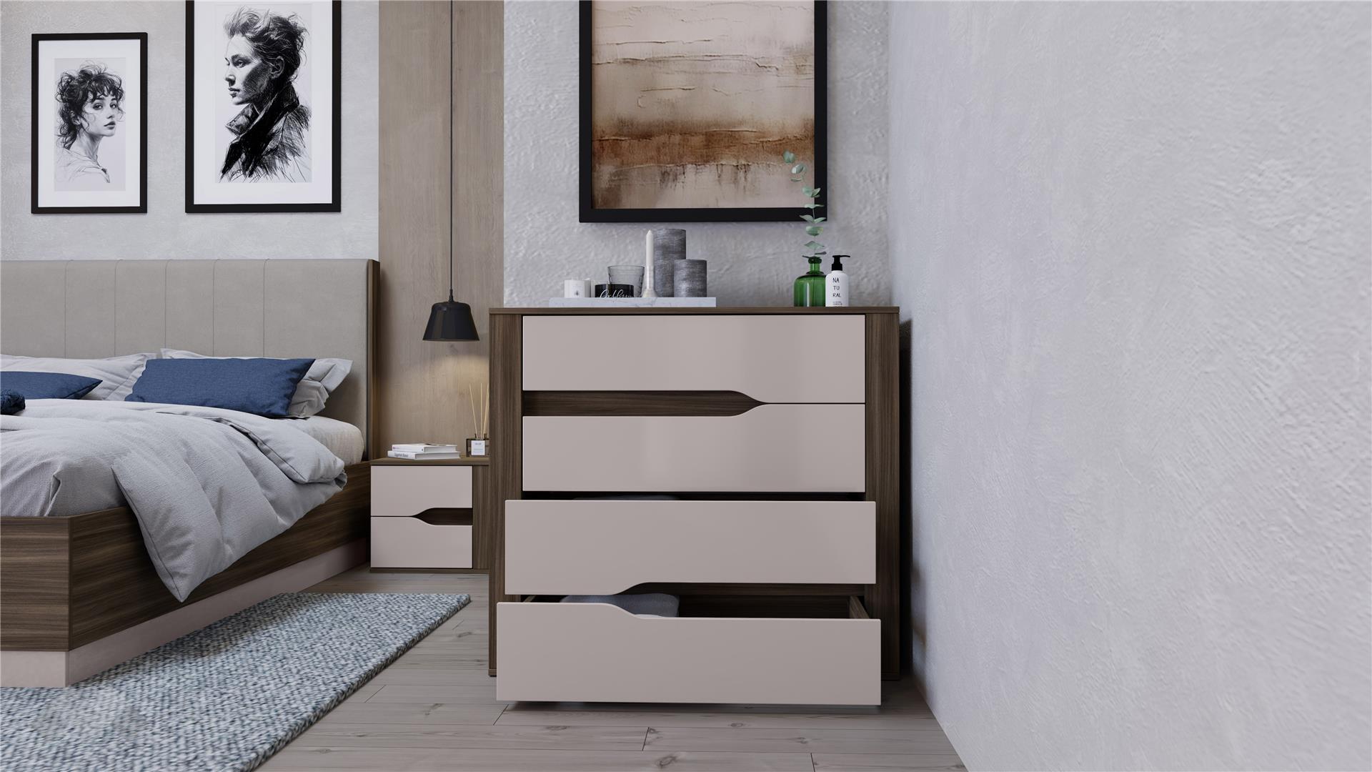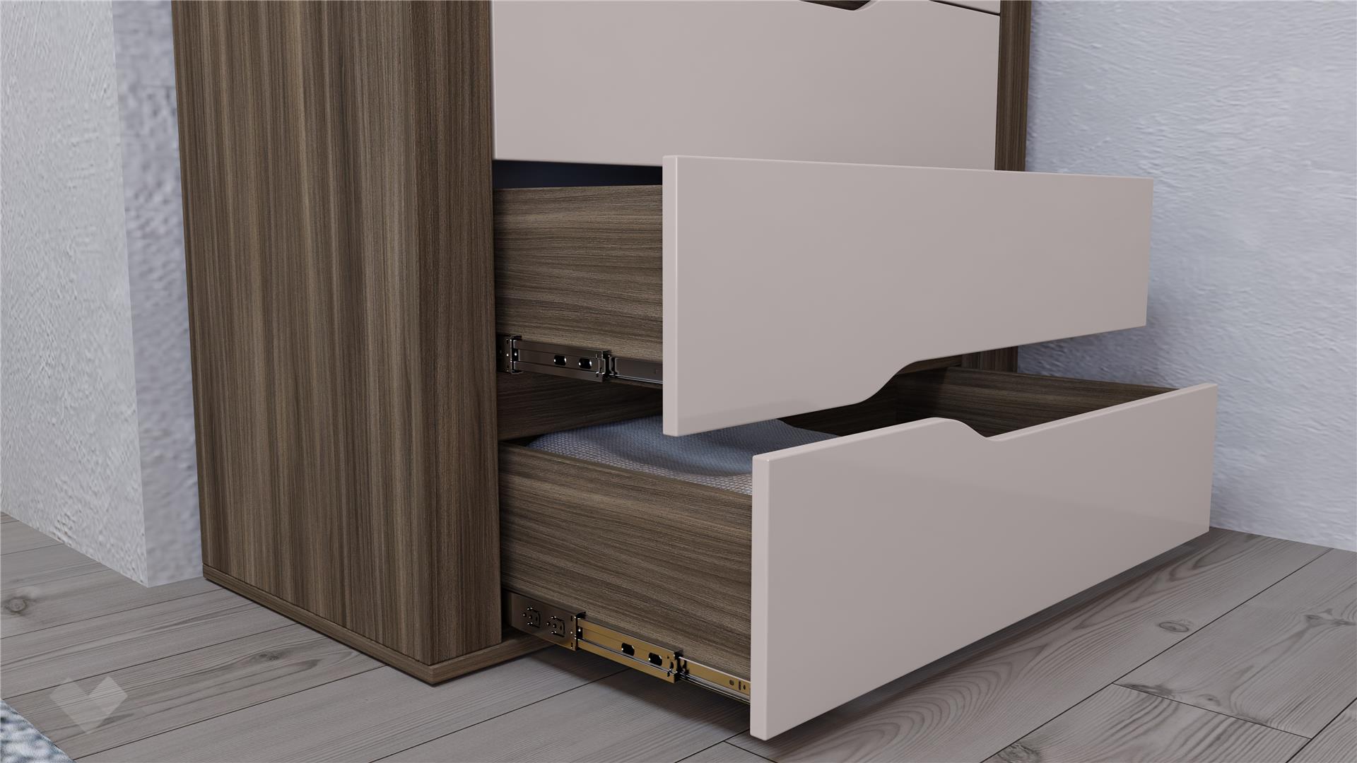Скринът с четири чекмеджета е изключително практичен за съхранение на дрехи, спално бельо и лични вещи. Чекмеджетата са снабдени с телескопични водачи, които позволяват плавно и пълно изтегляне, гарантирайки удобство и надеждност в дългосрочен план.
