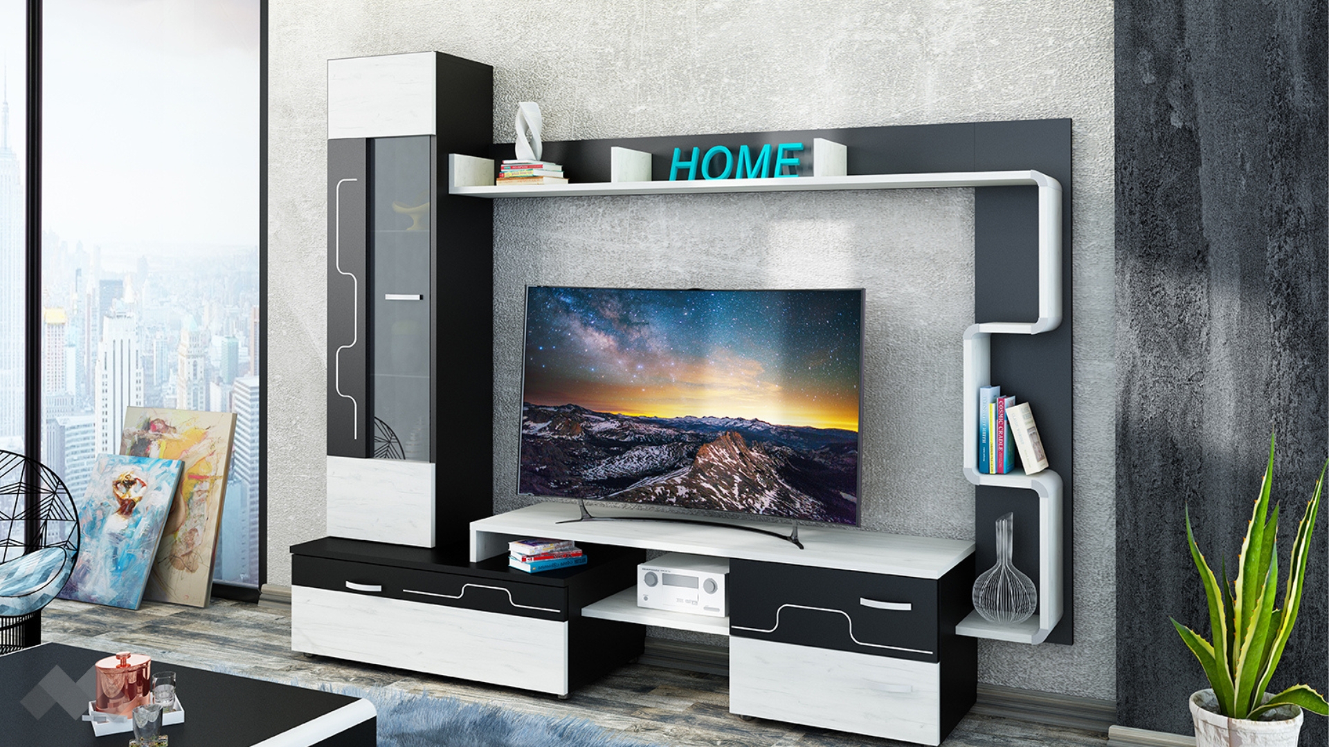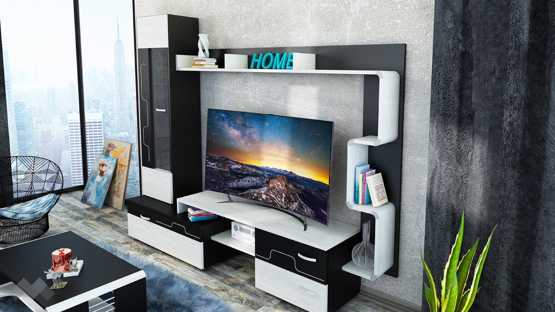 ⭐ Предимства: ✓ модерен дизайн ✓ витрина ✓ ТВ шкаф ✓ 2 чекмеджета ✓ ефектна етажерка ✓ качествена изработка ✓ 18 мм ПДЧ