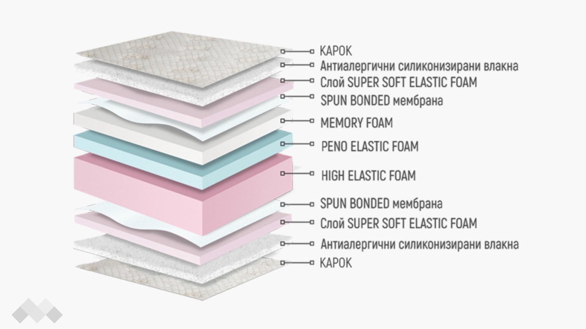 Термочувствителната мемори пяна, следва перфектно вашите извивки и създава усещане за лекота, снемайки цялото напрежението от тялото и ума. Заради насложените пластове пяна, във вътрешността се създават перфектни условия за свободно циркулиране на въздуха. Така вашият матрак се предпазва от замърсявания и вредители. Калъфът на матрак Лаго е от MARGANE текстил със силиконизирани влакна, обработени антибактериално. Допирът до него е гарантирано нежен и не предизвиква кожни раздразнения и дихателни проблеми, поради липсата на вредни вещества.