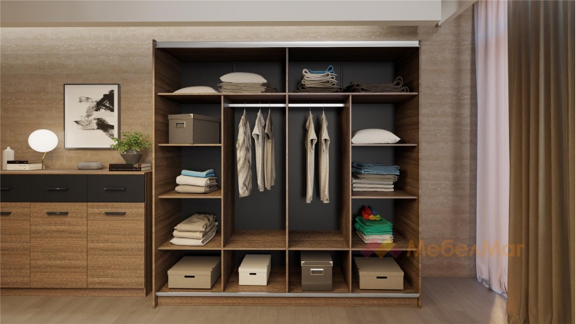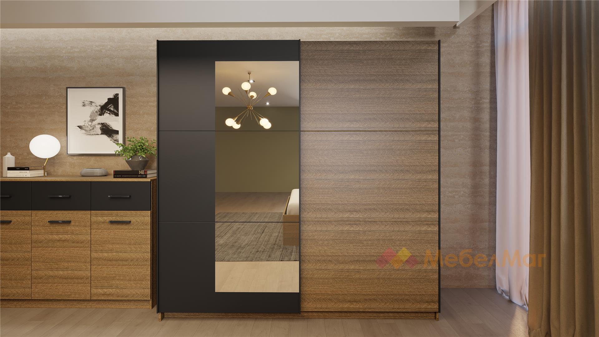 Гардеробът с плъзгащи врати е идеален за оптимизация на пространството. С дължина 200 см, той предлага практично вътрешно разпределение с достатъчно рафтове и лостове за закачалки. Огледалото в цял ръст на едната врата добавя усещане за простор и стил, като прави гардероба функционален и елегантен.