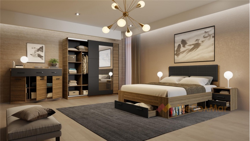 Сърцето на комплекта е елегантната спалня, създадена за удобство и стил. Тапицираната табла добавя мекота и лукс с черната си кожа и контрастния кафяв шев, докато голямото чекмедже и отворените рафтове от двете страни на леглото осигуряват допълнително място за съхранение на книги, аксесоари или спално бельо. Леглото е с високи лубове, които осигуряват удобна височина за сядане – 51-53 см с матрака.