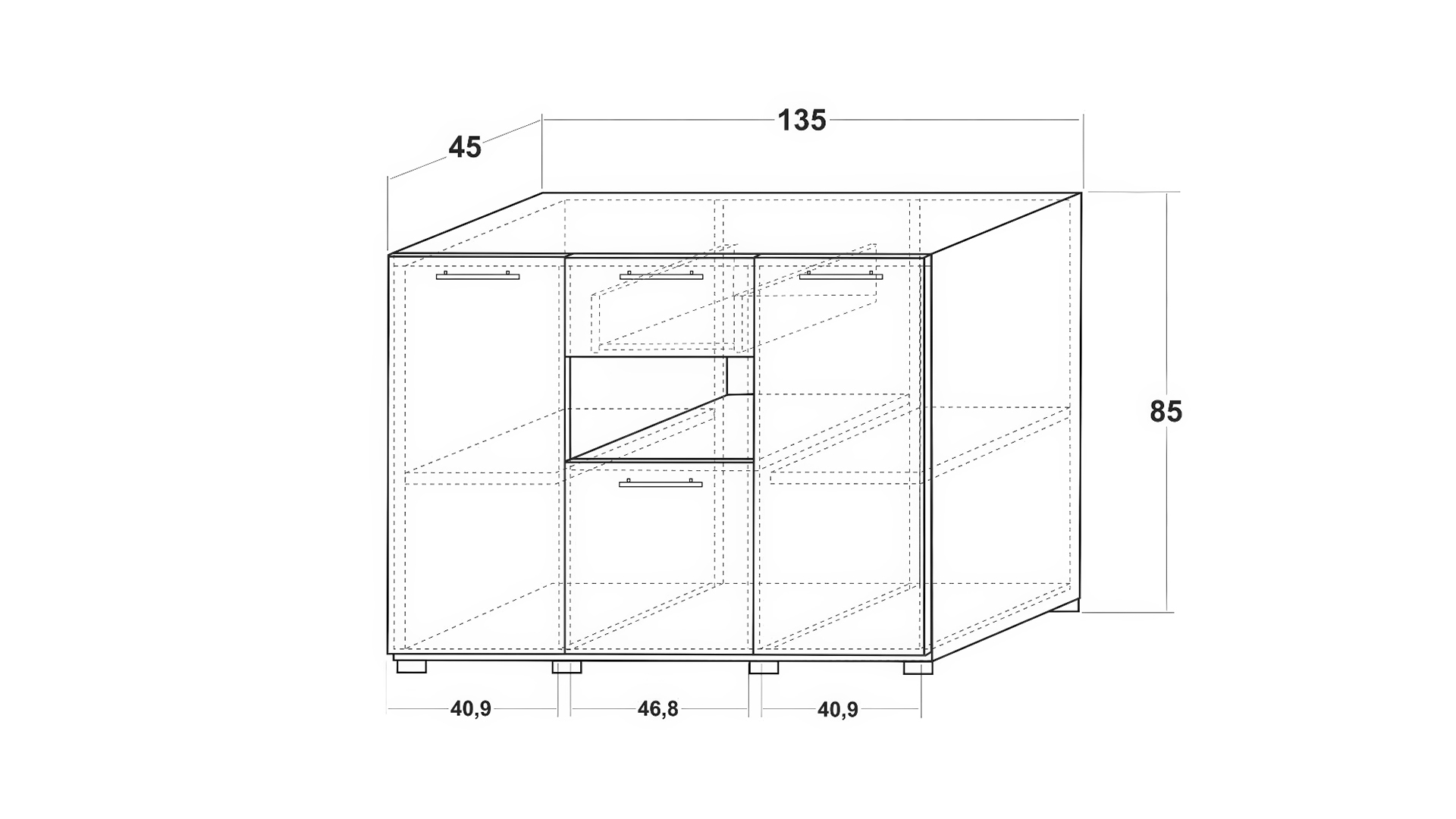 Моделът предлага добре организирано вътрешно разпределение – 3 шкафа, снабдени с 2 вътрешни рафта, които са идеални за съхранение на дрехи, спално бельо или други вещи и един открит рафт за вещи, които искаш да си ти под ръка. В допълнение, разполага и с удобно чекмедже, подходящо за дребни предмети като ключове, документи или аксесоари. Плотът на скрина може да се използва и като поставка за декорации, рамки или осветление.