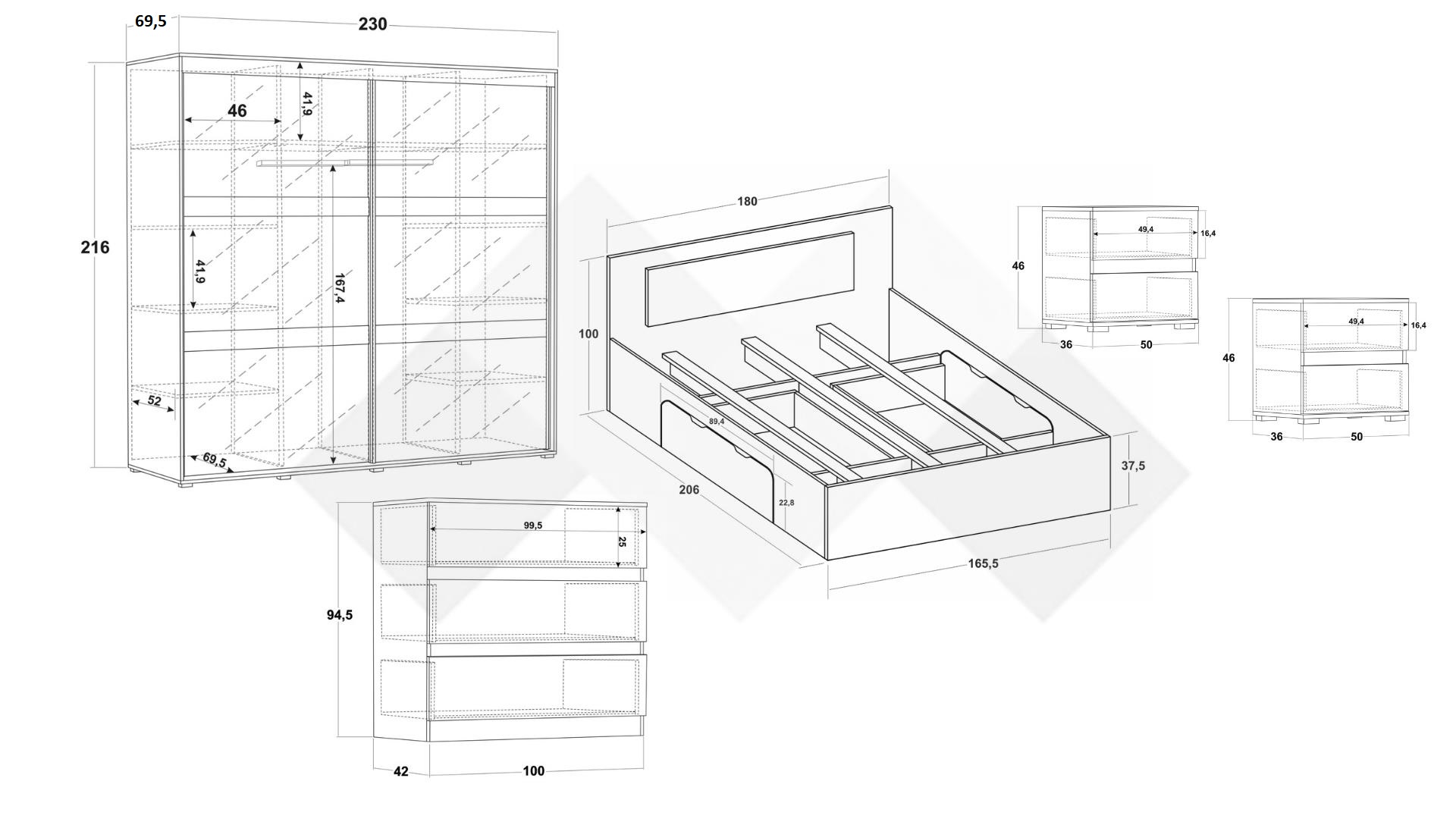 ⭐ Предимства: ✓ спалня с 2 чекмеджета ✓ гардероб с плъзгащи врати ✓ огледала ✓ 10 рафта ✓ 2 лостa за закачалки ✓ 2 бр. нощен шкаф с 2 чекмеджета ✓ скрин с 3 чекмеджета ✓ модерен декор ✓ практично разпределение ✓ качествена изработка ✓ 16 мм ПДЧ