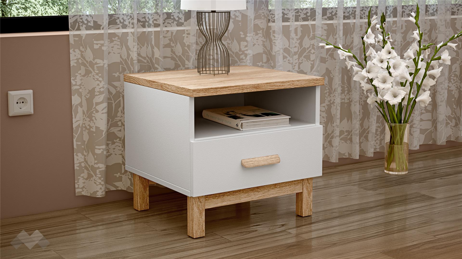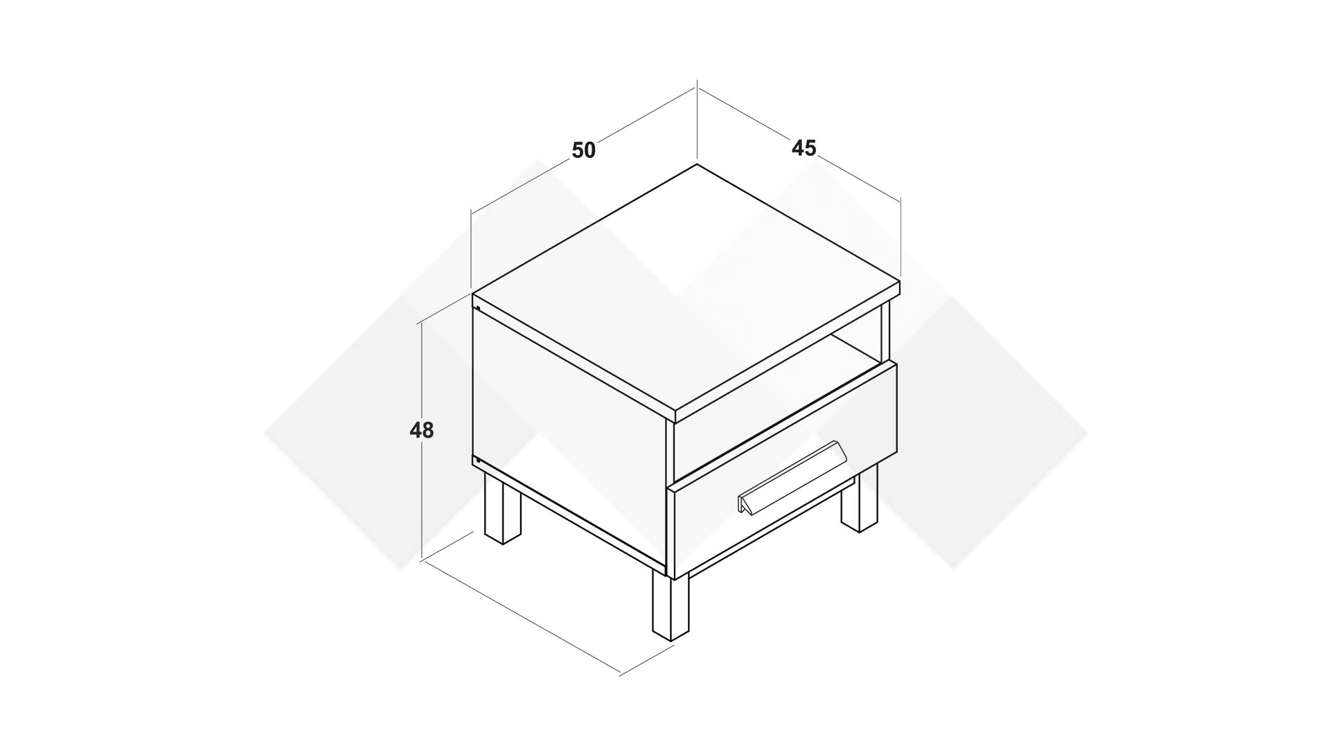 Нощният шкаф е проектиран с мисъл за максимална функционалност в компактни размери. Над чекмеджето има отворена ниша, която е идеална за поставяне на книги, списание, телефон или други предмети, които искате да са бързо и лесно достъпни.Под отворената ниша е разположено едно дълбоко чекмедже, осигуряващо дискретно място за съхранение на лични вещи, които не желаете да са на показ.