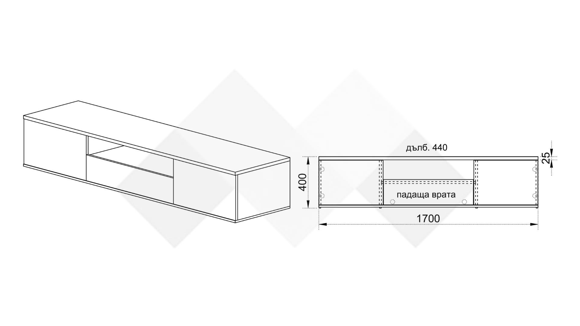 ✓ 1 чекмедже ✓ 1 отворен рафт ✓ 2 затворени шкафа ✓ ТВ шкаф с място за ТВ 170/44 см ✓ модерен дизайн ✓ механизъм за плавно затваряне ✓ компактен и практичен ✓ качествена изработка ✓ 16 мм ПДЧ