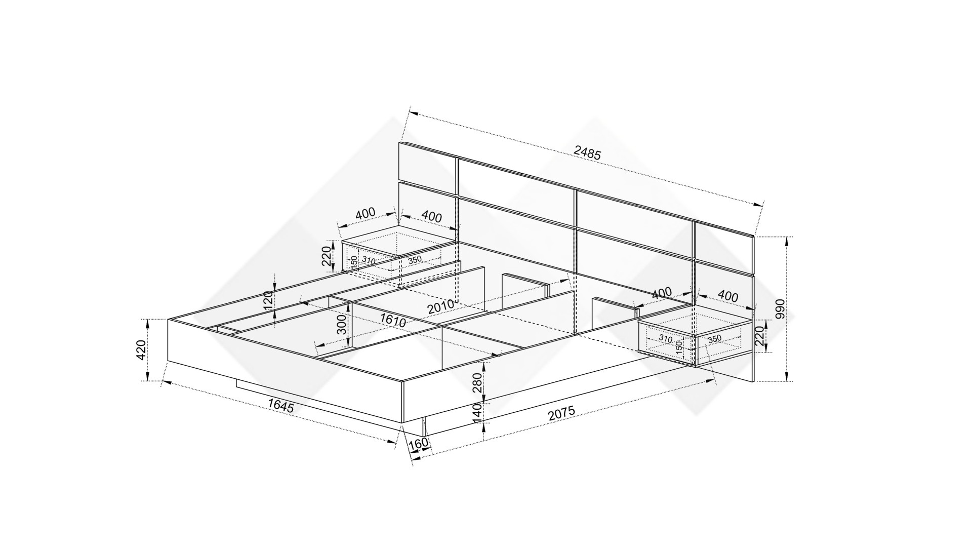 Спалня с нощни шкафчета: Д: 207,5 см Ш: 248,5 см В: 99 см