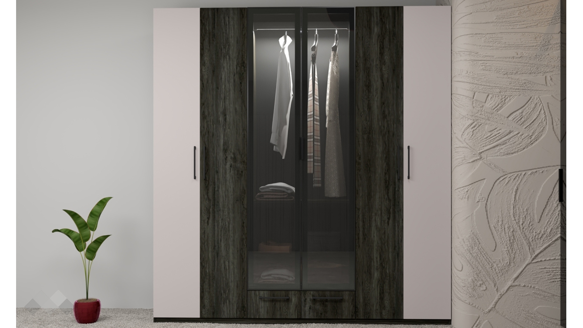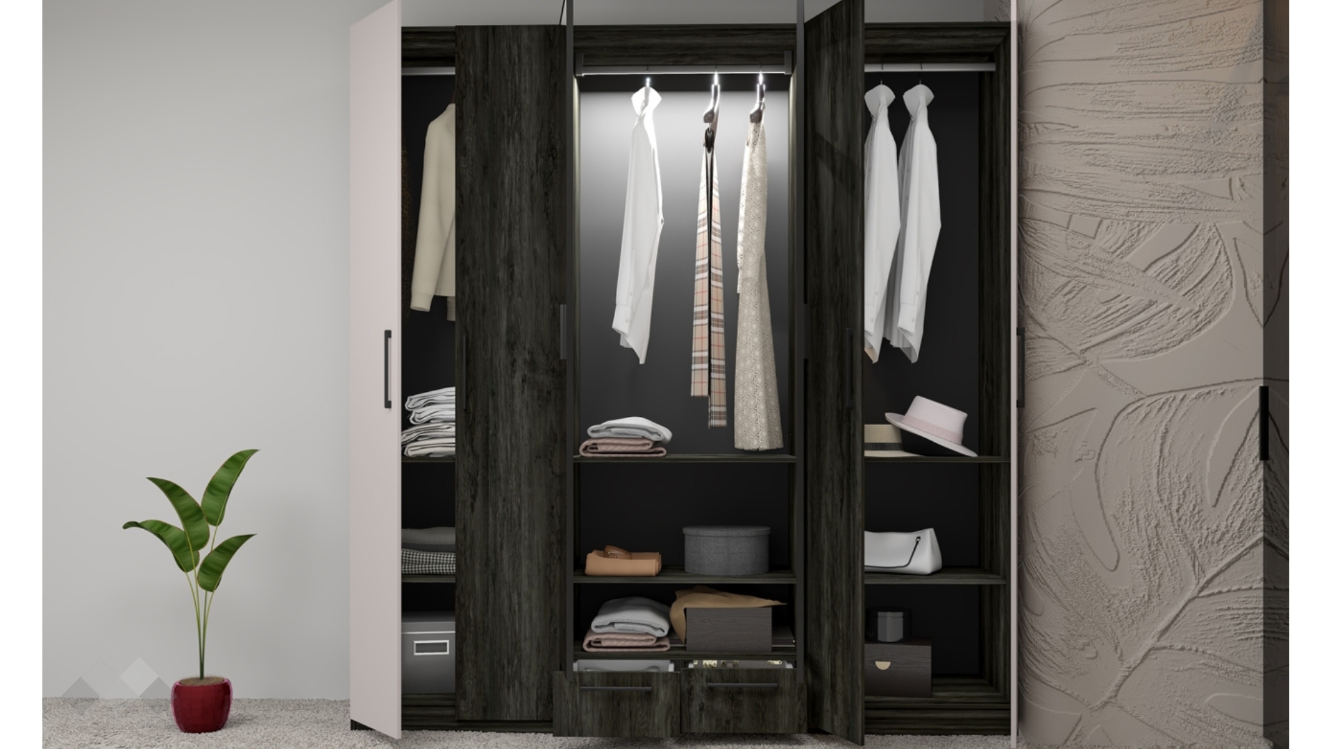 Моделът разполага с шест рафта, на които можеш да поставиш спално бельо, сгънати дрехи и кутии за съхранение на по-дребни вещи, както и с три лоста за закачалки, на които ще намериш място за елегантните си тоалети. Различното в декора на гардероб Лондон е при средните две крила, които са с алуглас врати, а лостът за закачалки отвътре е с LED осветление.