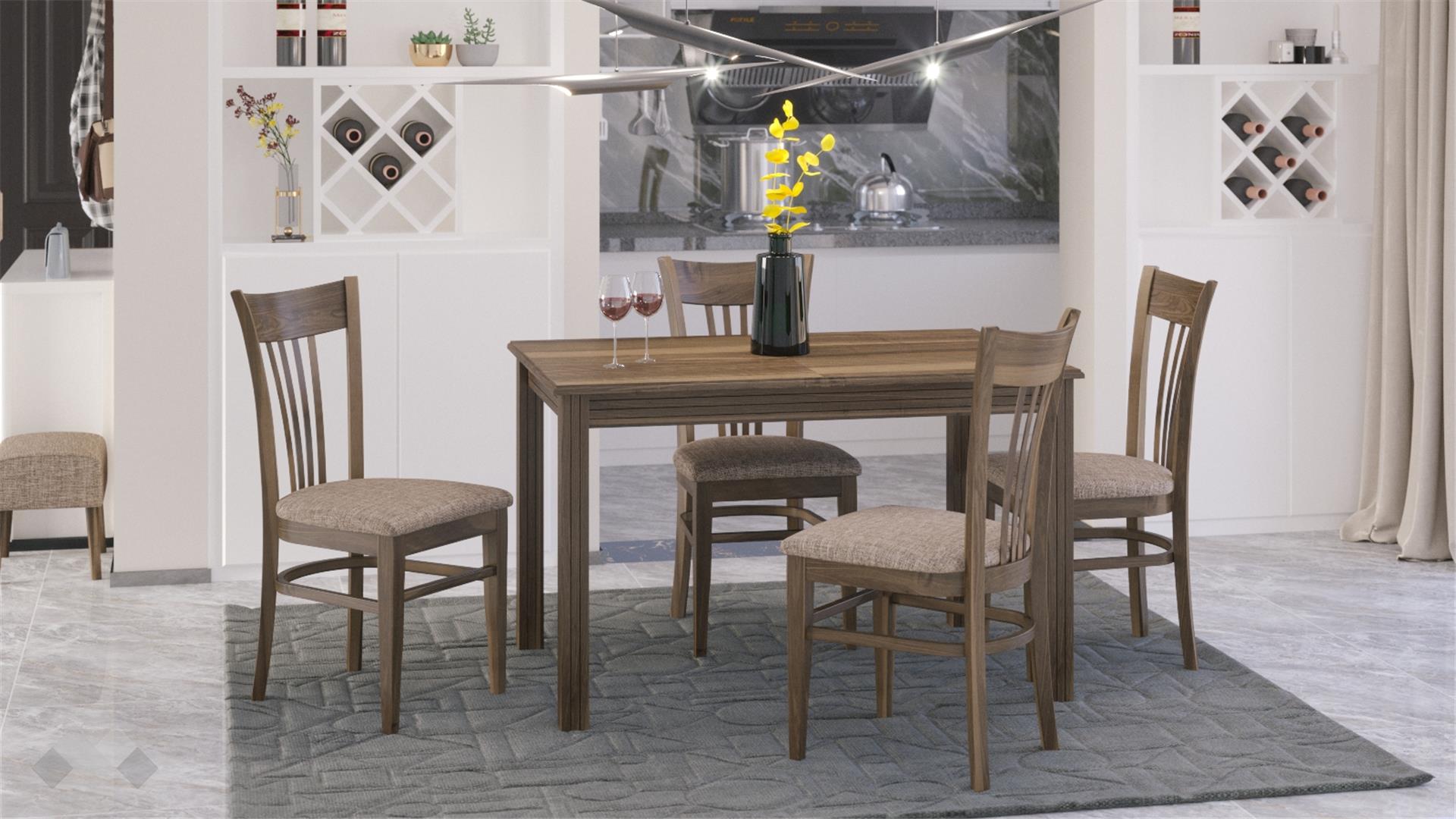 Столът е със здрава конструкция от естествена букова дървесина за устойчивост и стабилност, а лаковото покритие добавя елегантност. Седалката е проектирана с твърда основа, тапицирана с дунапрен за повече комфорт при седене и завършена със здрава текстилна дамаска, лесна за поддръжка.